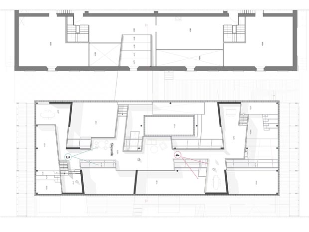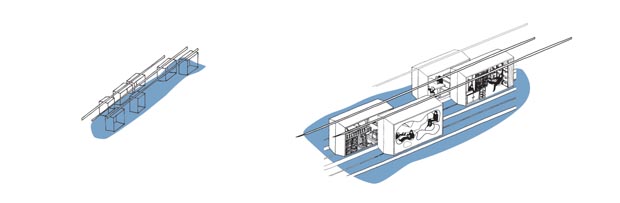 The main given element for configuring the atelier and workshop spaces is a set of movable wagons along the three set of rails underneath the skywalk. 3 wagons on each level make a total of 9. Each wagon provides an inside space of 3.2m by 1.4m and about 2m of height. This volume is proposed as a three dimensional empty canvas waiting to be filled. Big storage shelves for material, shelters for withdrawal, offices spaces, libraries and such are imaginable. The filling can be enclosed to one side or the other, completely permeable or completely closed.