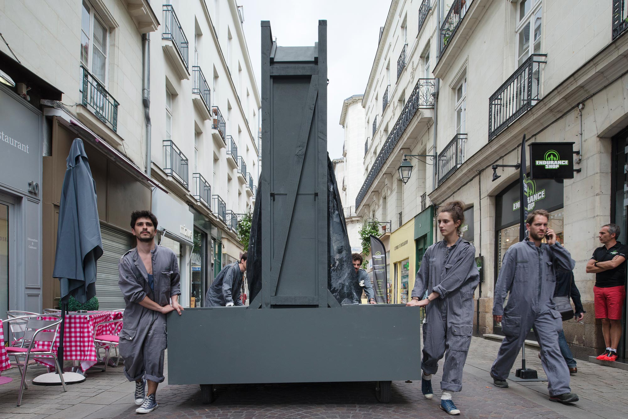 Raumlabor came with a set of drawings, inspired by the poetic drawings of the american architect John Hejduk. In his sketches, he talks about a poetic reinterpretation of the trojan horse for and through architecture. raumlabor takes this inspiration and brings it into the arts, into the city of Nantes, into the public spaces of the city. During the workshop the main narrative evolved, away from the military connotation of the trojan horse being a medium of attack and focussing on the object itself. Like this, the question of the possibilty of the monument entered the conversations in the camp. The production shifted accordingly. Four movable monuments were built and two movable instruments.