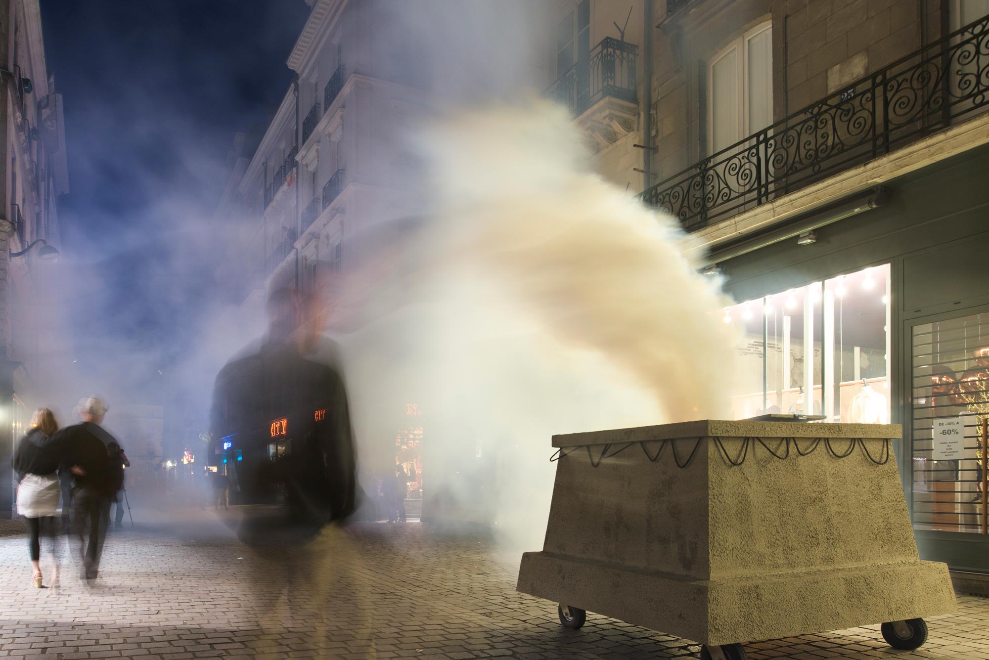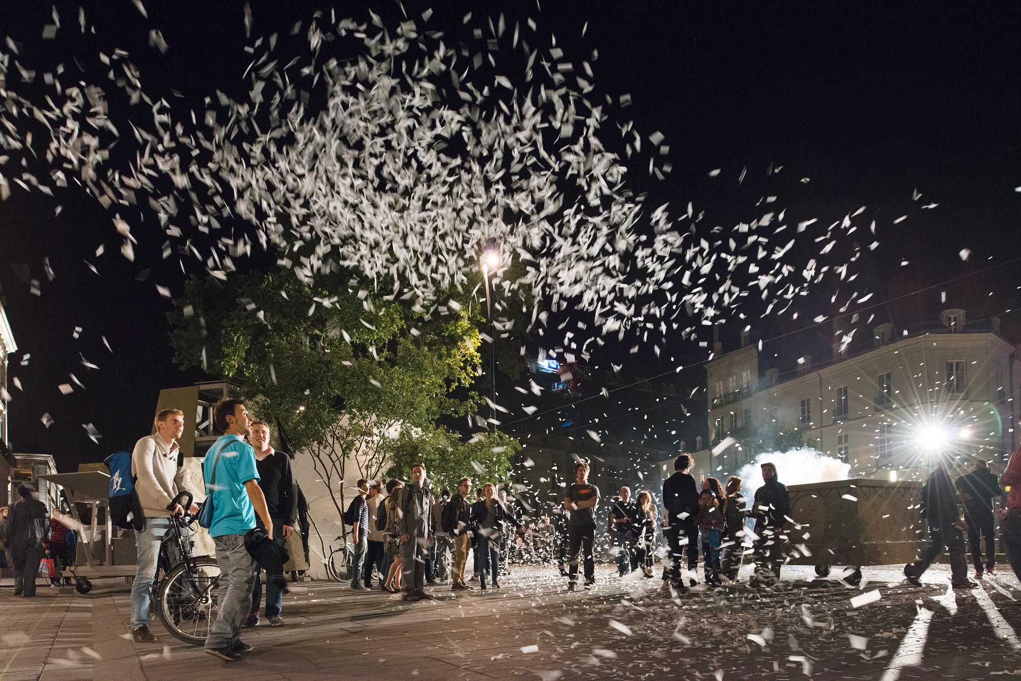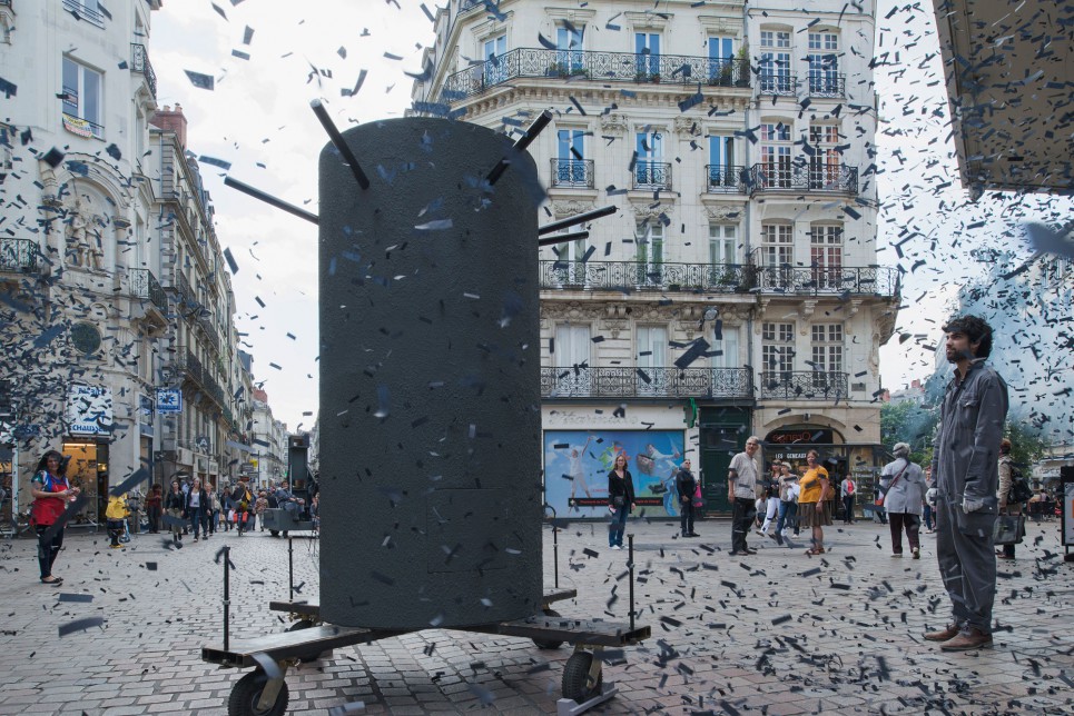 On the 28.06.2013 the workshop group teamed up with a lot of people from Nantes, to move the objects through the city together. Encountering the occasional daily city users mostly unexpected, the pieces started to create their own athmospheric layer in the city. Accumulated moments of intensity unfolded, when the public entered the inflated sphere, the monument to public space released a large and growing cloud of smoke. From “le destin” you could hear seven bangs and turning around you discover a swarm of small paper stripes flying in the air. These two cloud like appearences immediately embraced the winds and started touching the city’s hard surfaces.