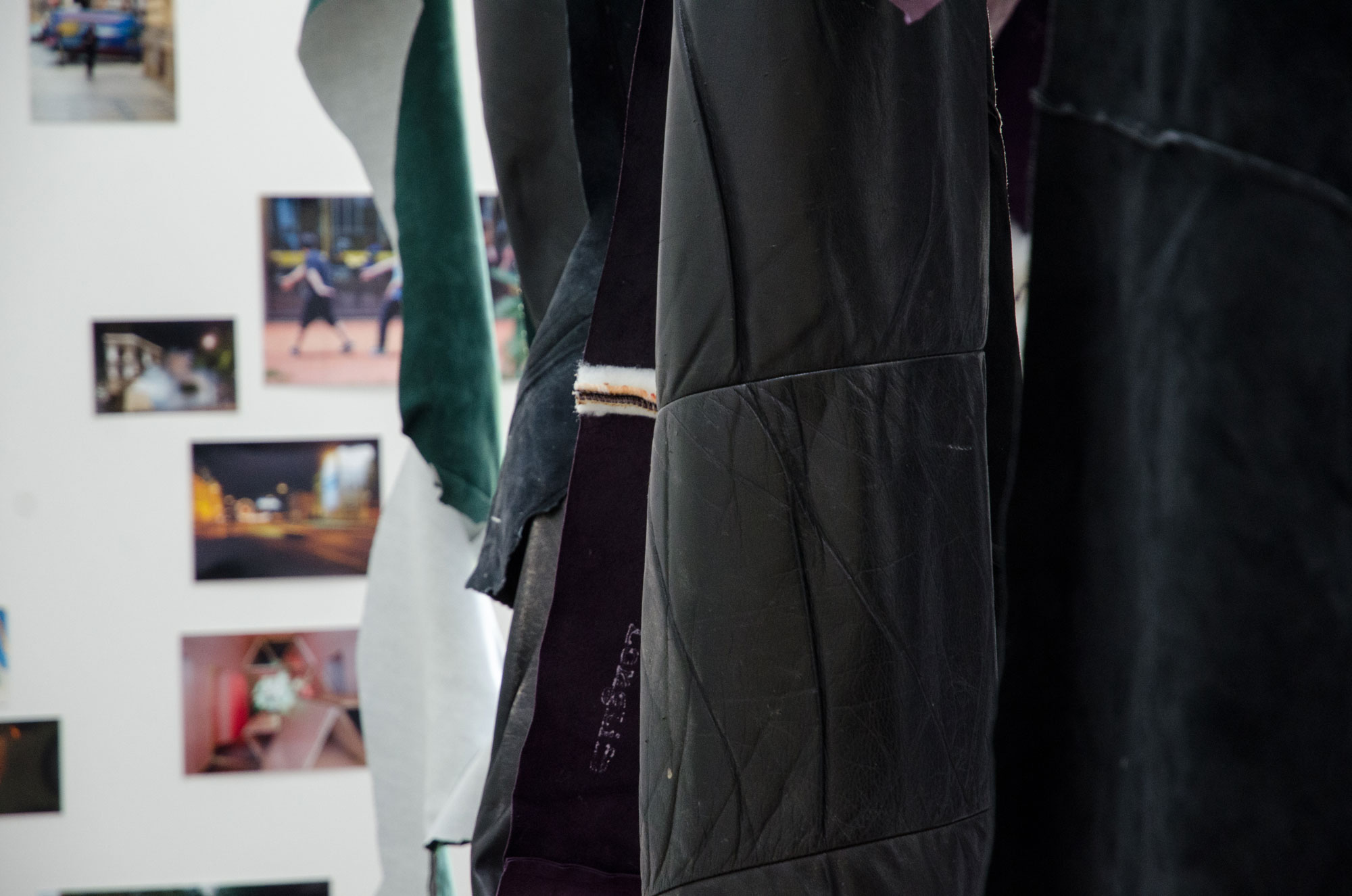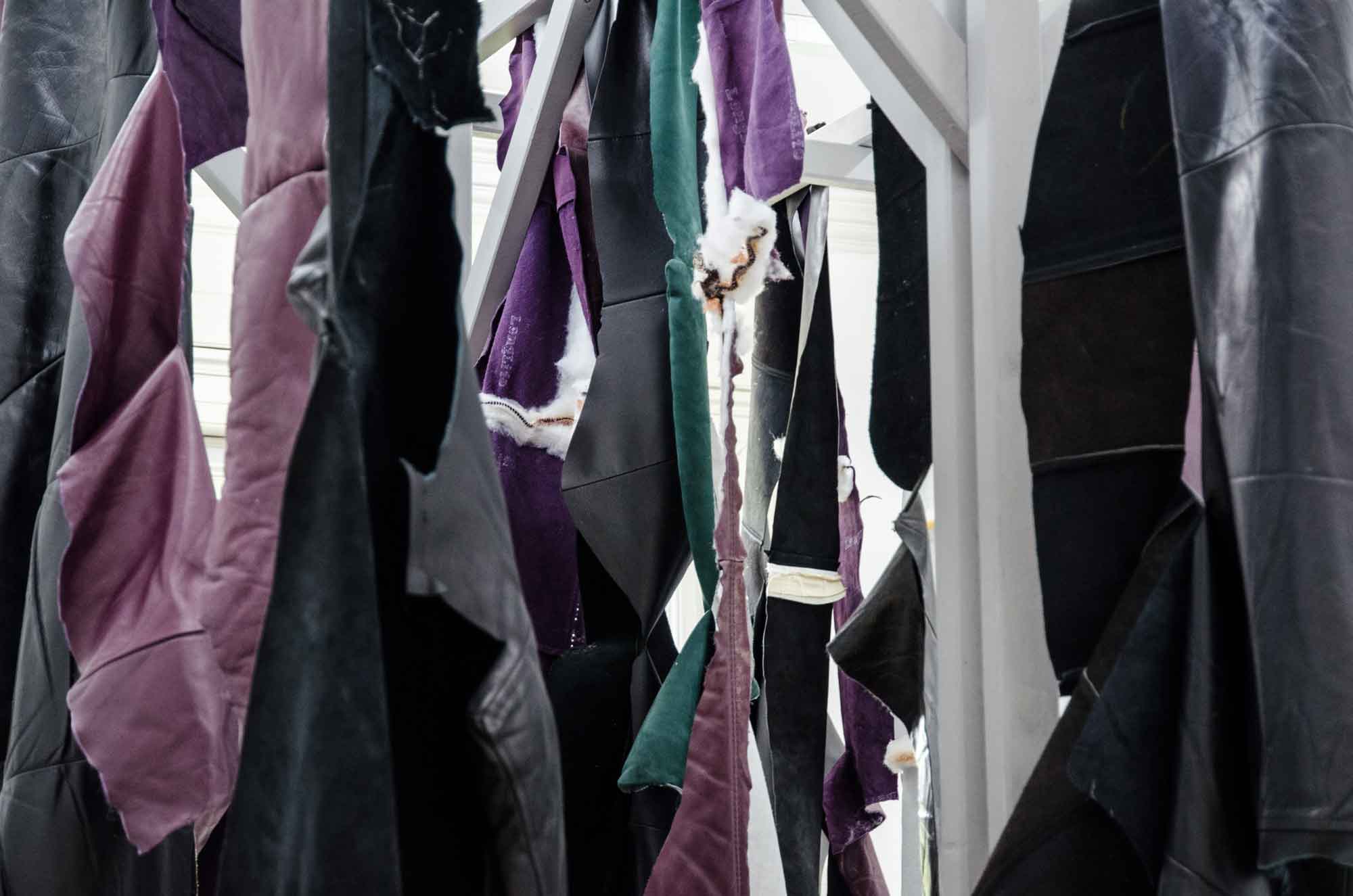 MOUNTAINS ARE MADE OUT OF ROCKS zeigt ein Holzgestell, behängt mit Lederhäuten vor Ort gehäuteter Sofas. Ein einfacher Akt des Öffnens, des Zurschaustellens und des Vorzeigens von sonst Verborgenem, sowie ein Akt der Zerstörung und Transformation. Die Arbeit könnte eine Zwischenstation sein, ein physisches Interim zwischen Wertschätzung und Häutung, Ressource und Erinnerung, Material und Bedeutung.