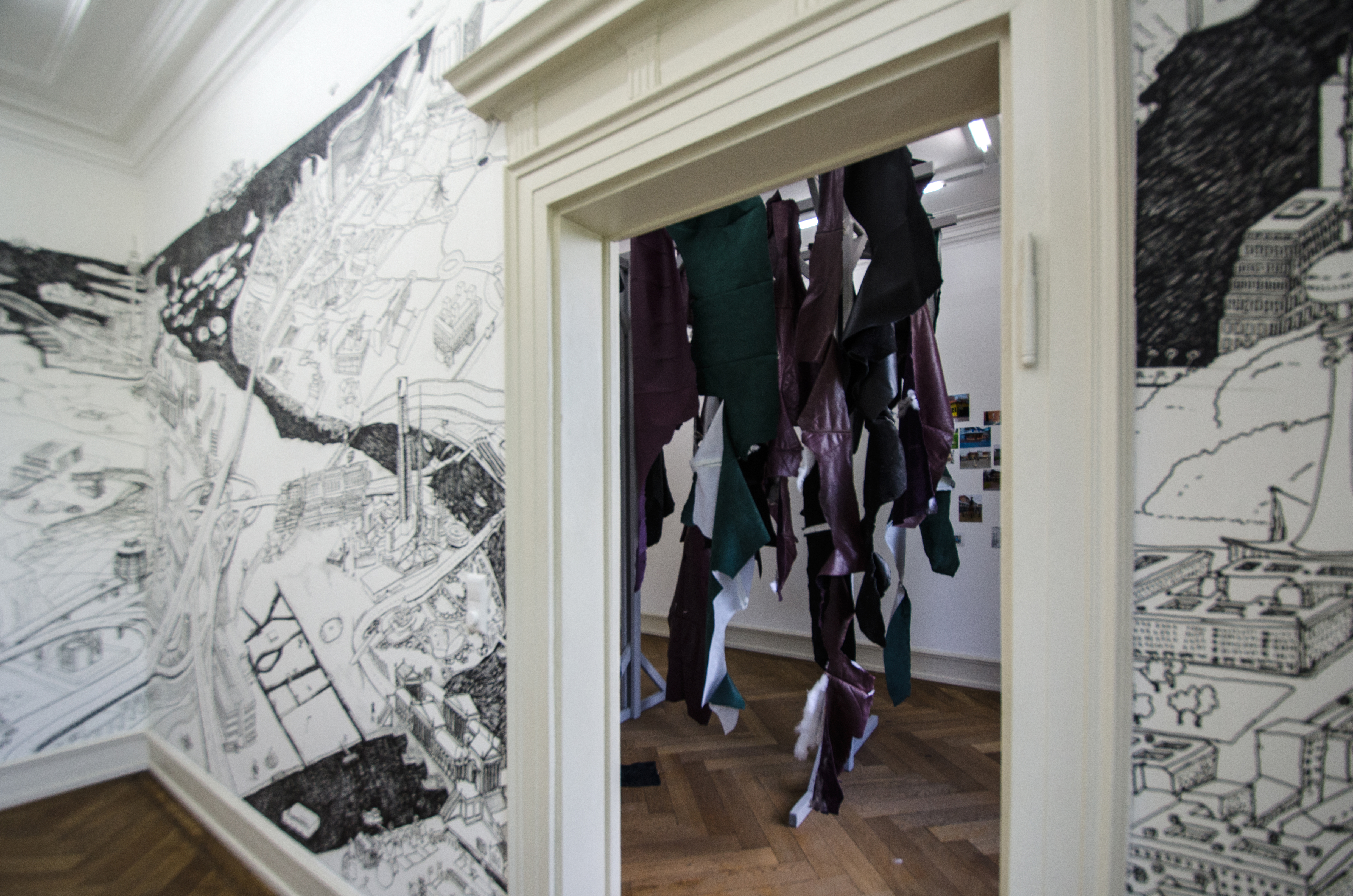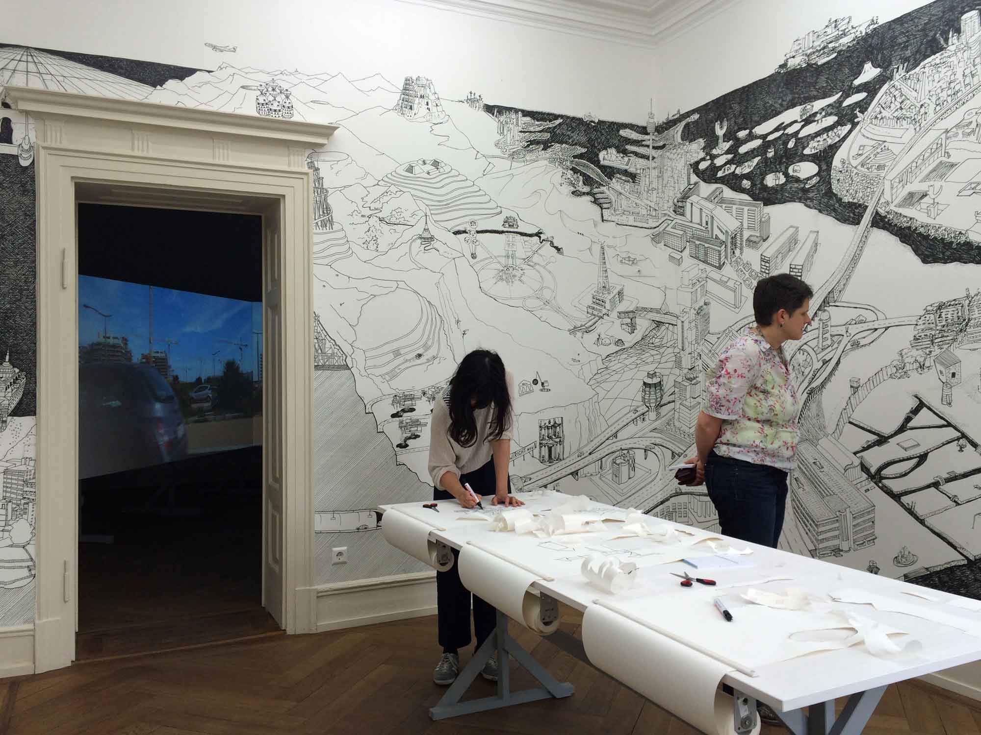 STICK ON CITY ist eine aktive Zeichnung, gemacht um permanent erneuert zu werden. Auf die Wand tapeziert ist ein utopisches Panorama, eine Landschaft urbaner und architektonischer Phantasien und einiger realisierter Projekte. Besucher können selbst zeichnend ihre eigene Vision in die imaginäre Landschaft einkleben.