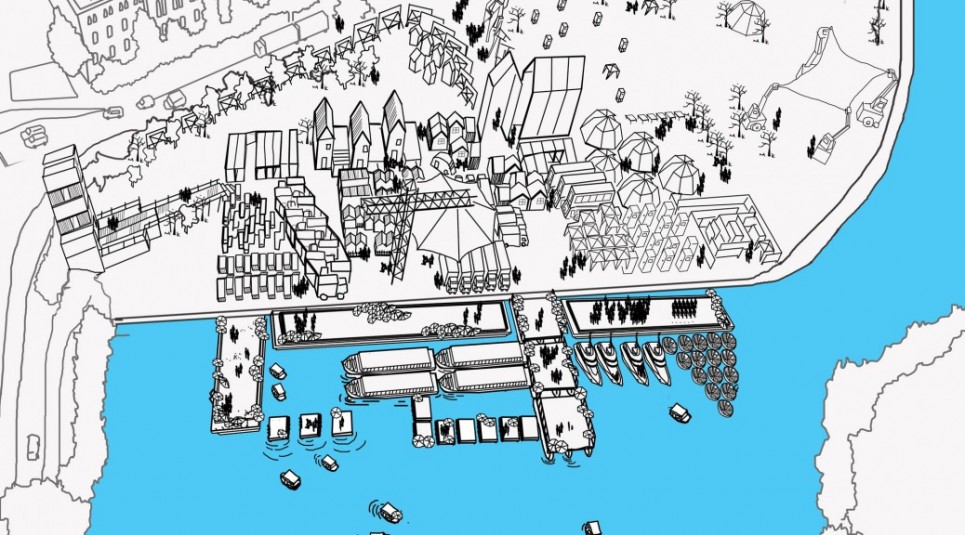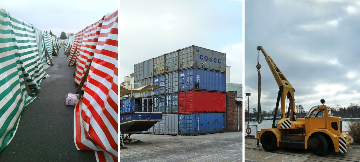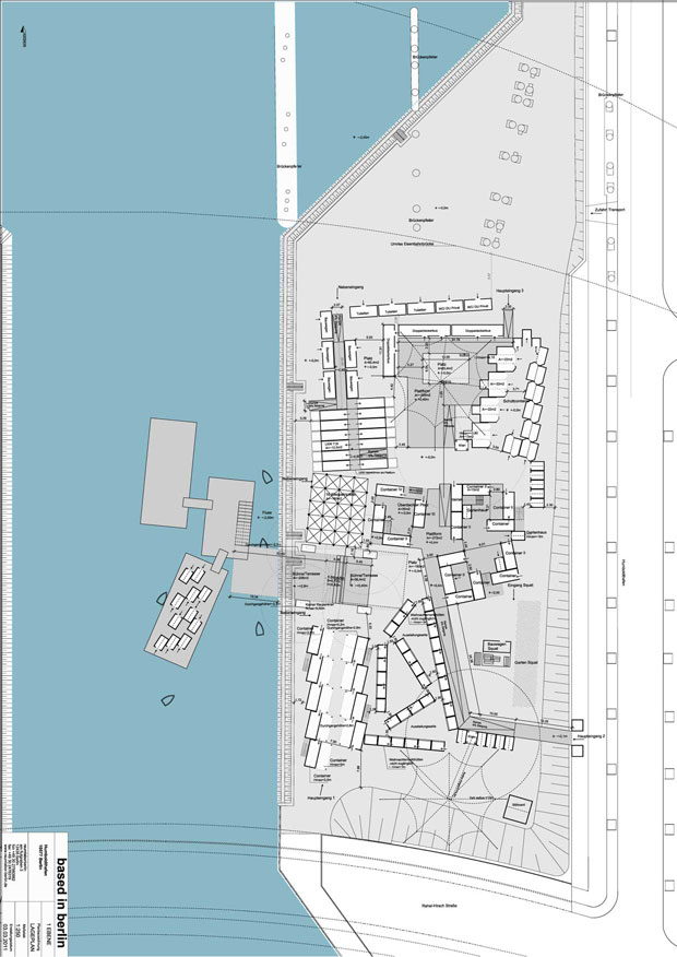As the winner of an international competition raumlaborberlin was commissioned with the realization of the exhibition architecture for the art exhibition „based in berlin“, which was supposed to take place on an empty site at the Humboldthafen in the center of Berlin. Our concept is based on a cooperation between the artists and selected Berlin-based firms. We deliberatly decided agaist a building to underline the temporary character of the exhibition. The exhibition architecture is generated from oridinary objects and diverse mobile containers. Berlin-based firms were asked to provid these objects for the time of the exhibition. In this way firmes from Berlin would help to create a stetting in which young contemorary art could present itself. Unfortunately the project was not realised because the curators in the end decided for another site our concept could not be transfered to.