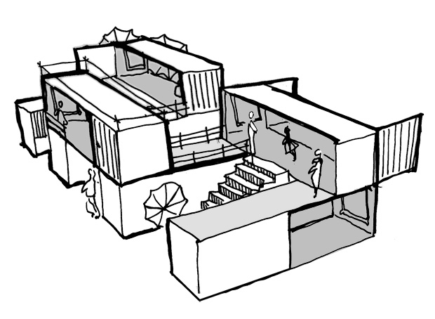 A cluster of stacked containers act as a gallery space, offering flexible spatial possibilities