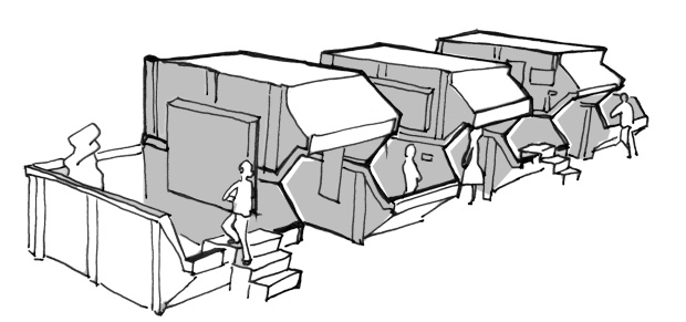 An agora- like square surrounded by mobile galleries can also be used for performances