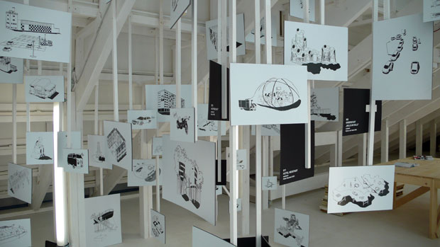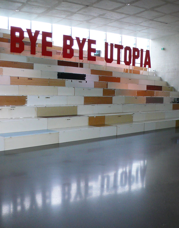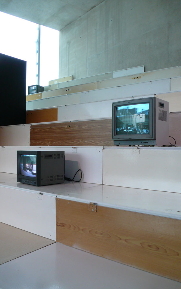 In the KUB Arena, raumlaborberlin has undertaken an architectural intervention, which reflects our main concerns and marks the space of the Arena as an autonomous location. A sloping plane cutting diagonally through the ground floor creates a second space which is accessible from the rear of the building. Above this slope, a walkable landscape made of doors from typical former East German ‘Plattenbauten’ (buildings constructed from concrete slabs) permits new perspectives on the architecture of the Kunsthaus. The construction space beneath the sur face serves to present the so-called ‘raumlaborwelten’ (lit.: space laboratory worlds) and gives room for lectures, workshops, and round-table discussions.