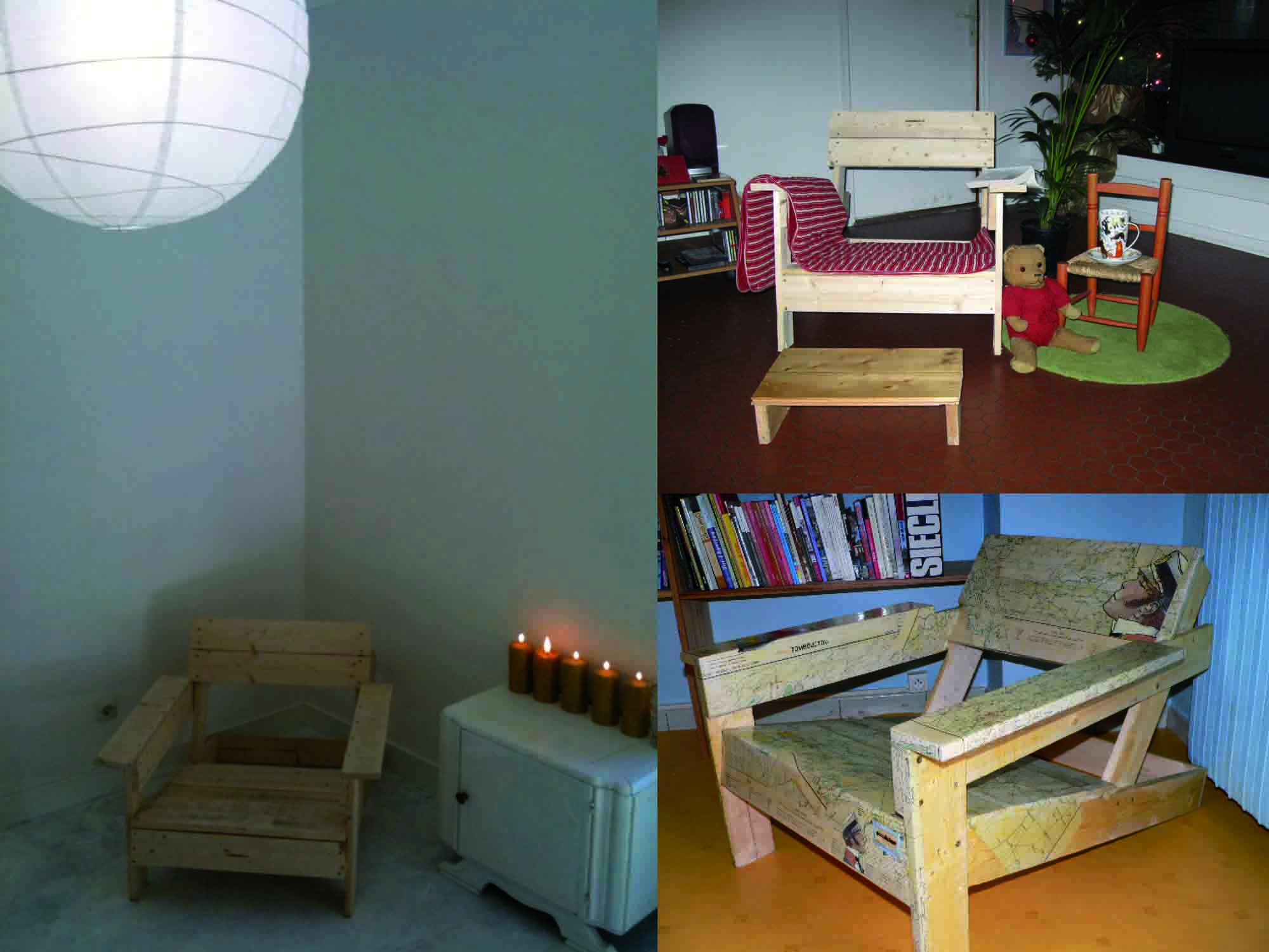 The installation set-up consists of a 3*3*1m large pile of wooden boards, pre-cut for the production of armchairs by the visitors of the exhibition – inside the exhibition.The armchair is specifically designed for this occasion. It follows the criteria: -easy to make -use only 3 lengths of wood -comfortable -easy to carry -desirable.