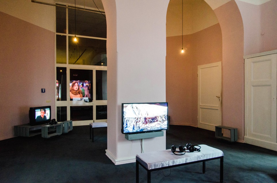 The aim was to create the cosy atmosphere of a living room, to which the artist responded by producing a background sound effect asking the visitors to take their shoes off. A feeling of intensity and surveillance, yet in an intimate way, was created, by the positioning of four monitors placed at 45o from the centre, facing in.
