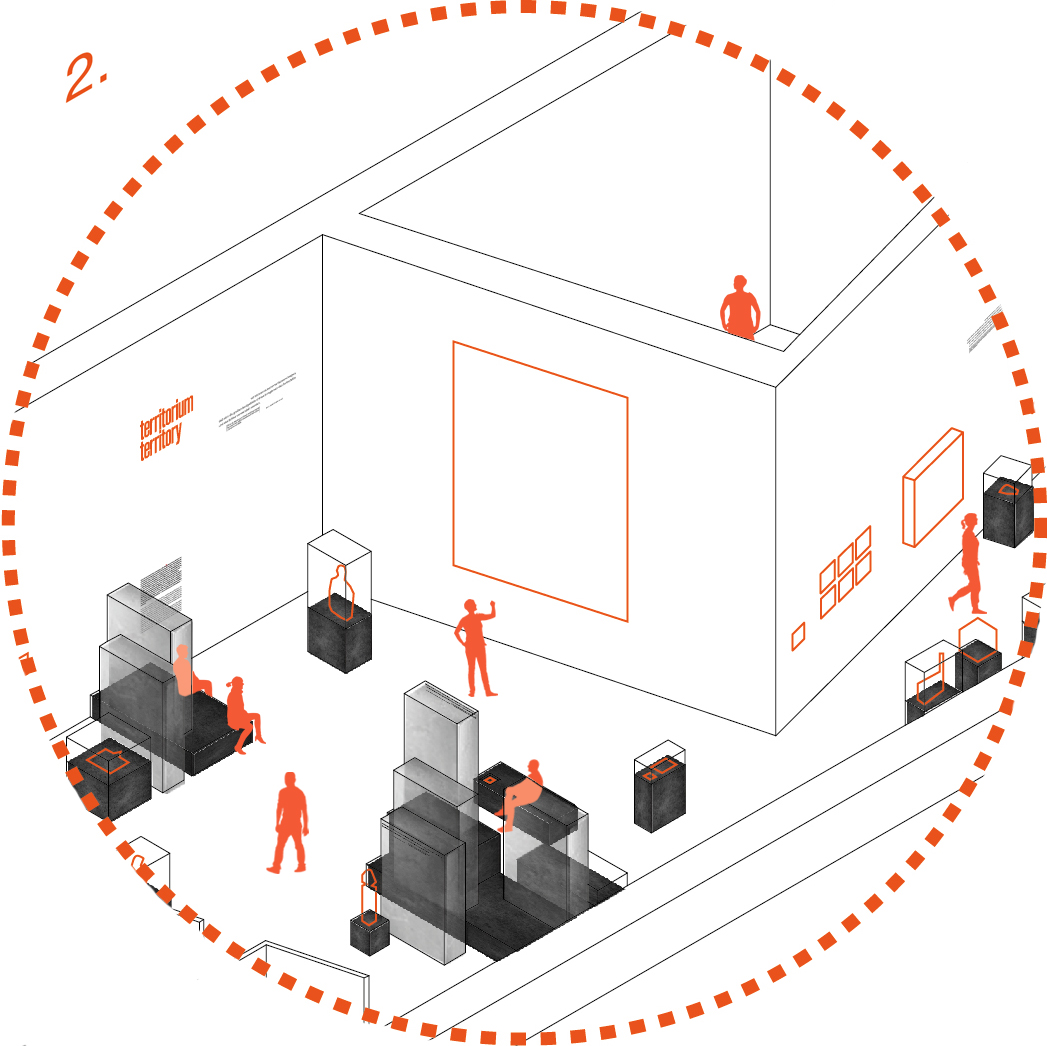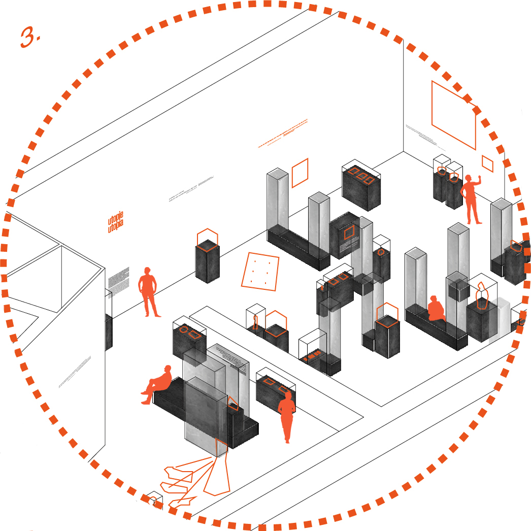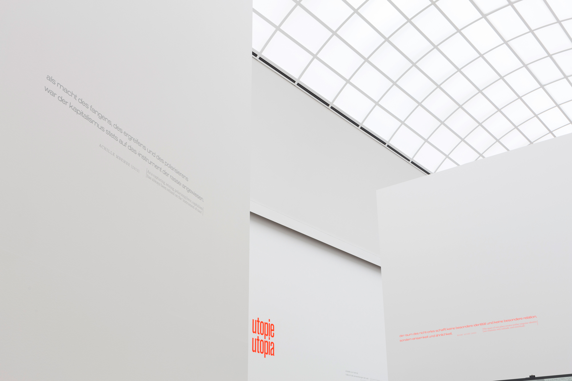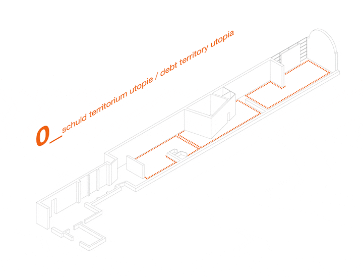 A landscape of empty vitrines forms the spatial structure of the exhibition into three chapters: Debt-Territory-Utopia. The architecture is creating diverse room sequences in which the visitor finally becomes part of the exhibition landscape. The empty vitrines, also think as „empty-room“, raise questions about the role of art and what it may be in the future.