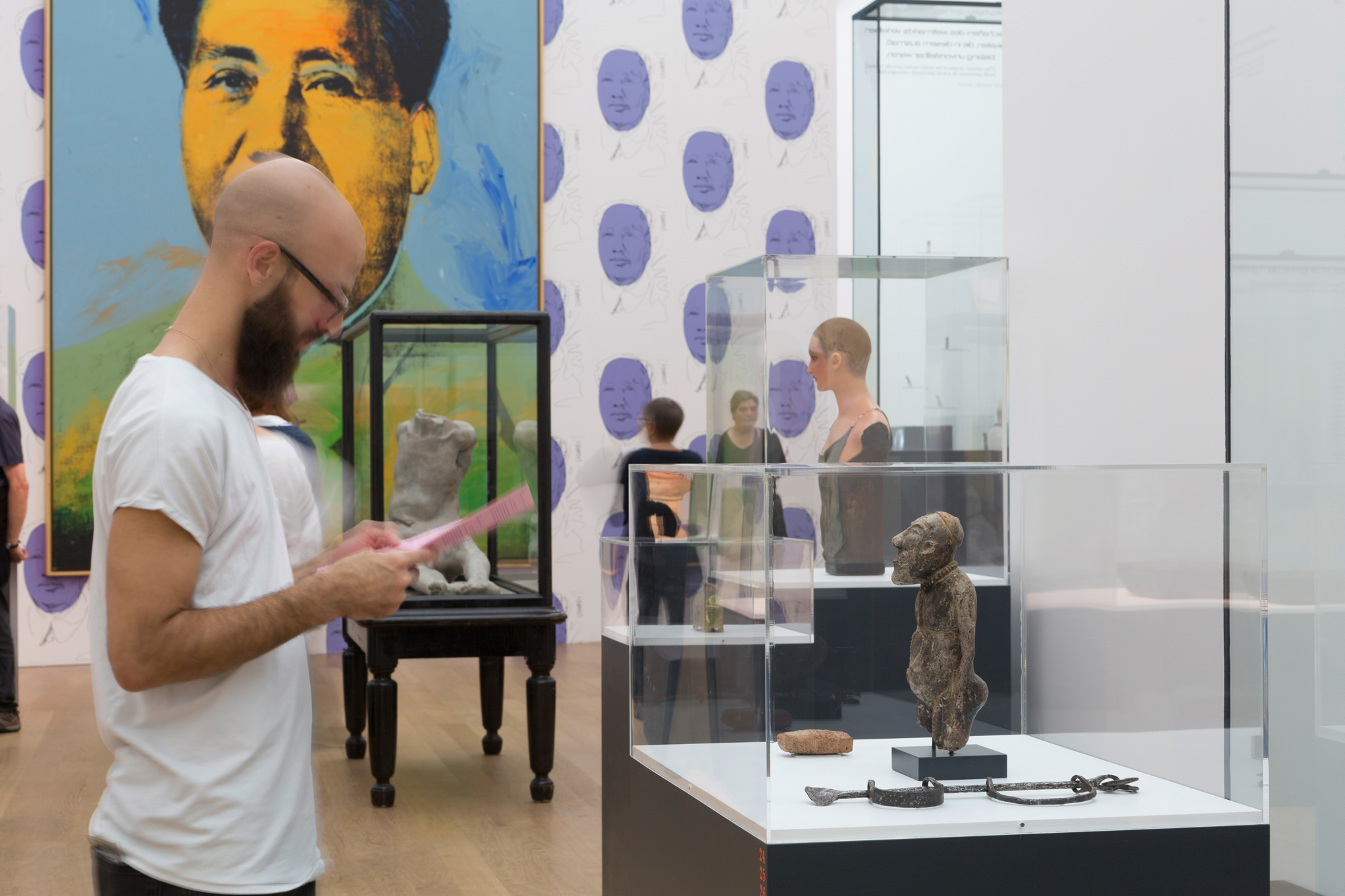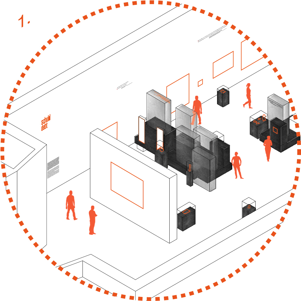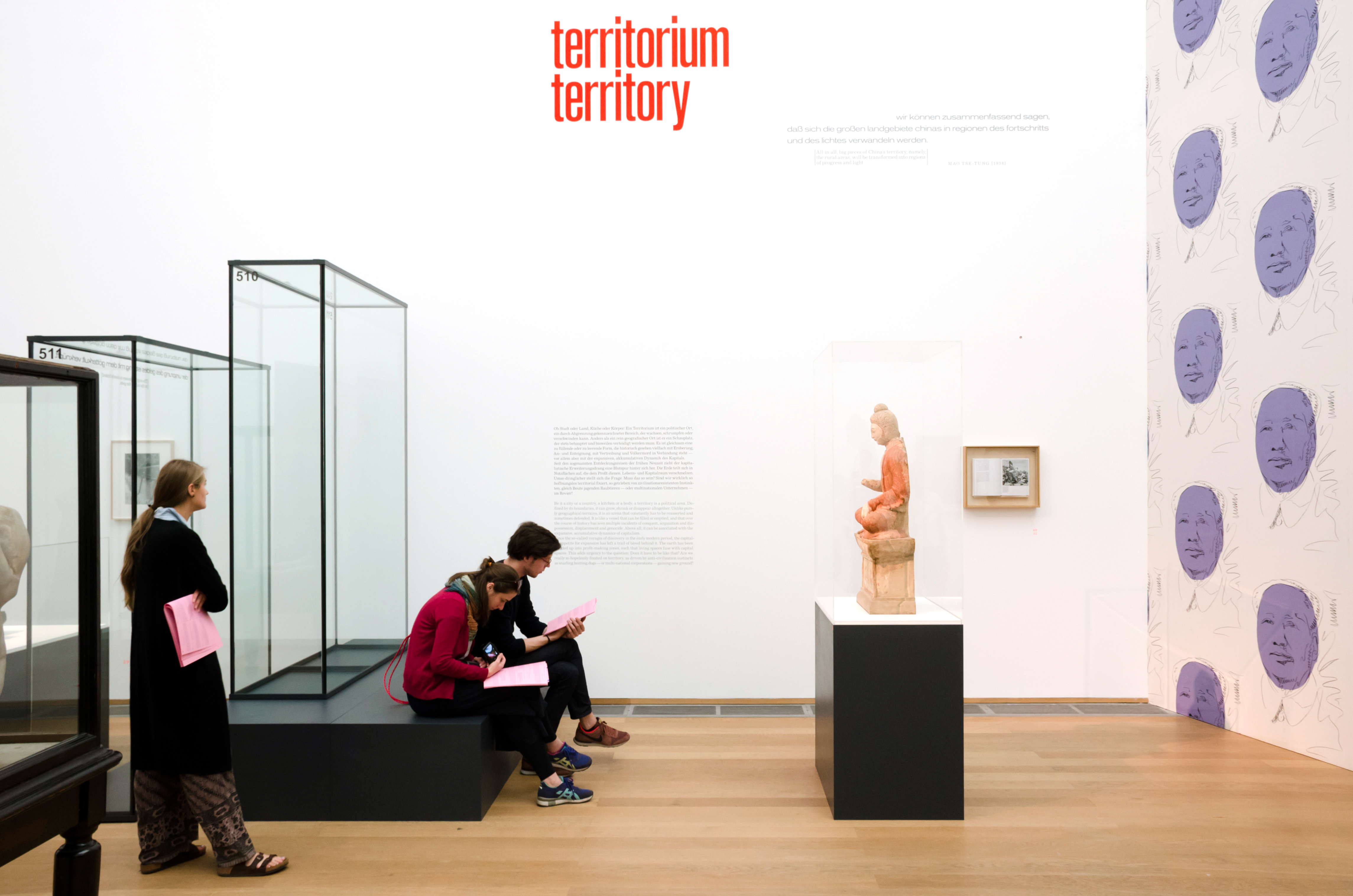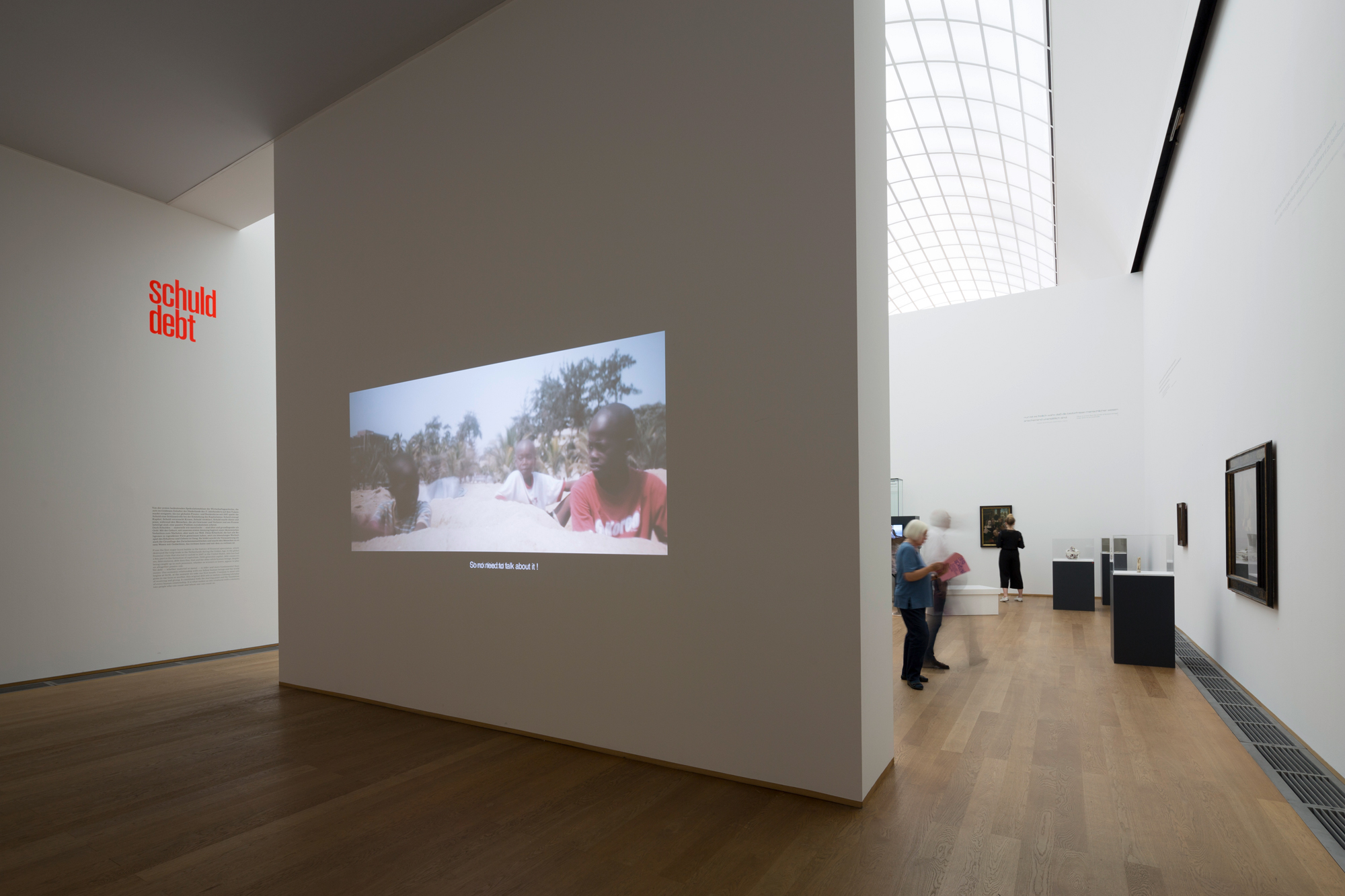 A landscape of empty vitrines forms the spatial structure of the exhibition into three chapters: Debt-Territory-Utopia. The architecture is creating diverse room sequences in which the visitor finally becomes part of the exhibition landscape. The empty vitrines, also think as „empty-room“, raise questions about the role of art and what it may be in the future.
