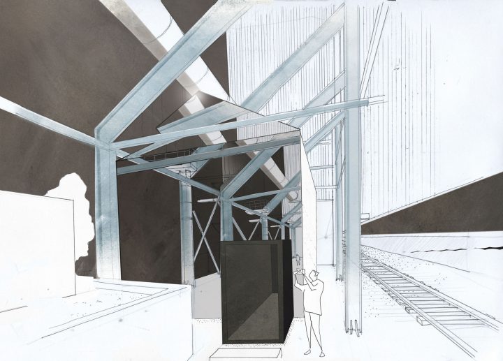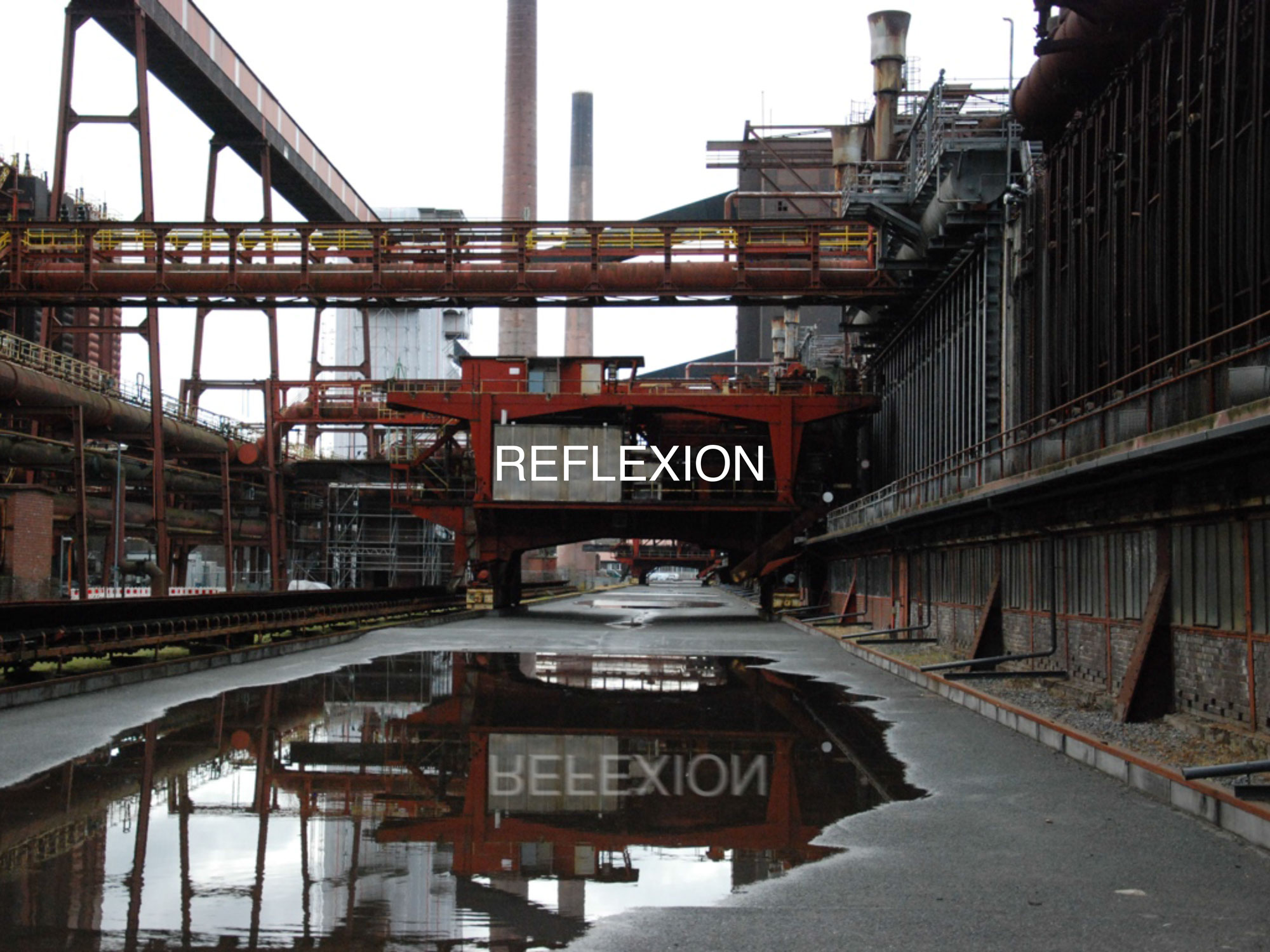 Der Zugang erscheint als Negativöffnung in dieser Spiegelung. Über den gebogenen Zugang tritt man in den Projektionsraum und kann durch die Dreifachprojektionen den Füllvorgang nacherleben. Wie auch schon bei den vorherigen Stationen intendiert, wird die Station in ein Spannungsverhältnis zum Ort gesetzt, so dass die Industriegeschichte und das persönliche Erlebnis einen Dialog bilden.