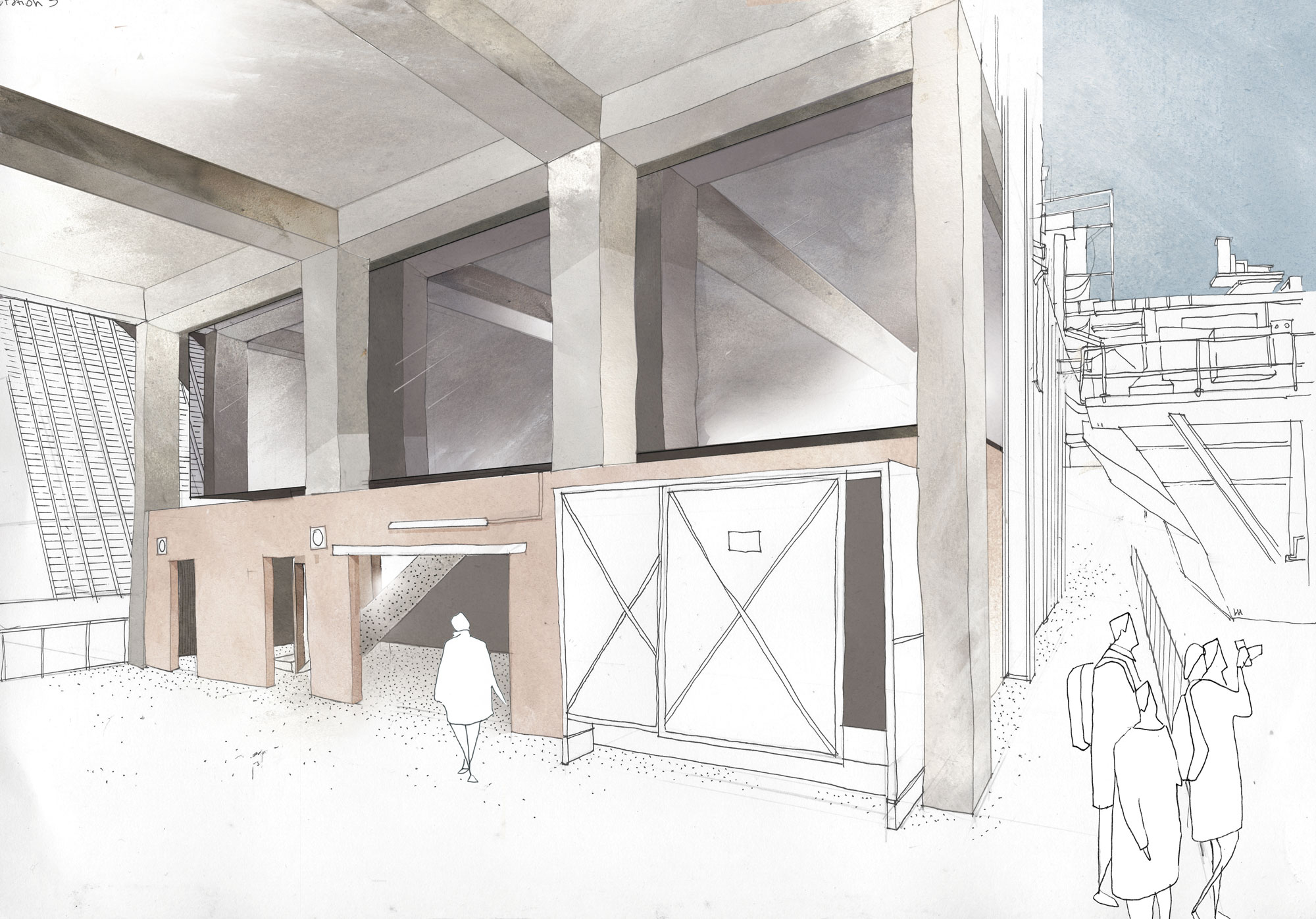 Die Innenräume bilden gefärbter und gewachster Sichtbeton. Die Konstruktionsart wird in Abhängigkeit vom weiteren Zeitplan und Nutzeranforderungen entwickelt. Aufgrund der großen Besucherzahlen und der Geschichte der Kokerei sollte die Bauweise einfach und sehr robust sein. Langfristig gesehen ist das aus unserer Sicht hier die nachhaltigste Vorgehensweise.