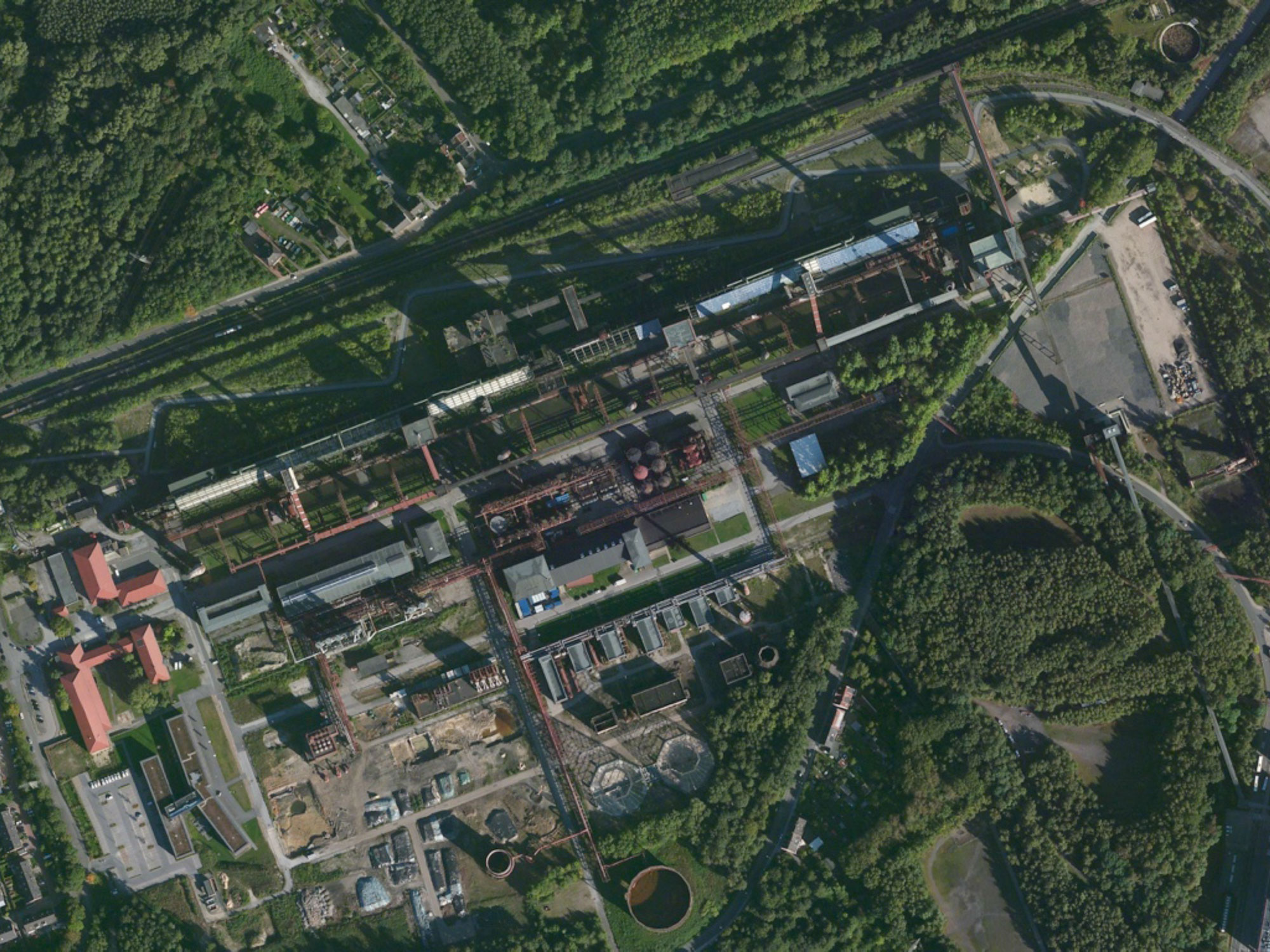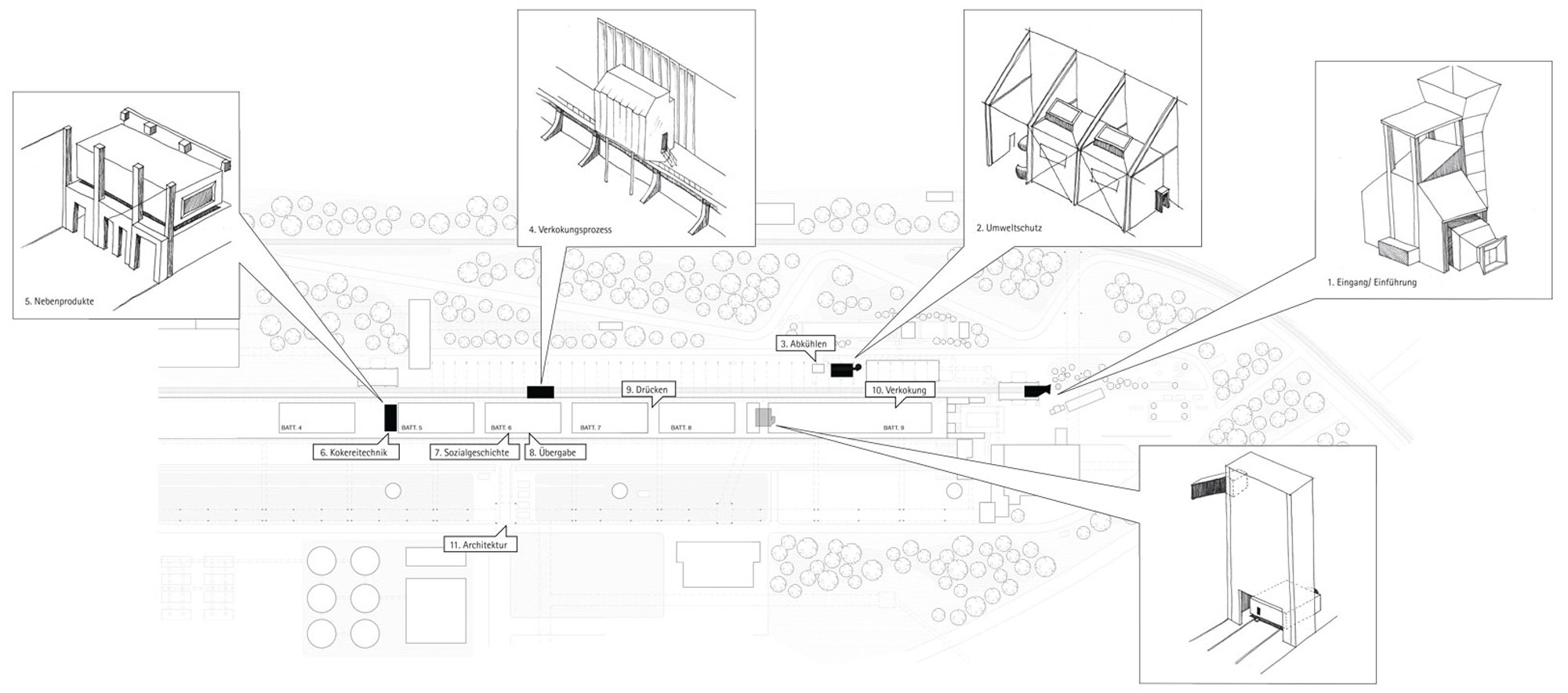 Durch das Herausrücken des Pavillons und den in Anlehnung an die Form des Löschturm trichterförmig ausgebildeten Eingang wird die Funktion der Station 1 als Eingangspavillon sichtbar gemacht. Vor der Station 1 liegt ein großer Haufen Kohle, gerahmt in einem Stahlbehälter, die gleiche Menge, in Koks verwandelt, befindet sich im Zentrum des Löschturms unter den Löschdüsen.