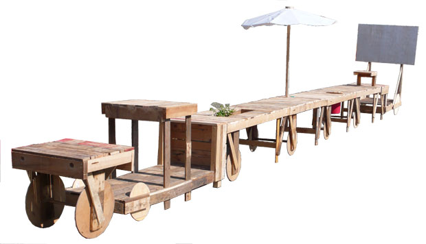 gebaut aus alten Paletten, Bambusstangen und leeren Kabel-Rollen