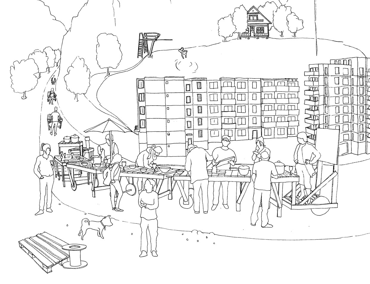 war eine Struktur für gemeinsame Abendessen, für Kinoabende, für den Bau eine imaginären Stadt mit Kindern, als runder Tisch und für Vorführungen.
