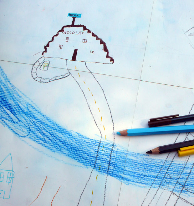 planen, zu zeichnen und zu bauen. Jedes Kind hat in einem ersten Schritt eine Lieblingsinstitution für das neue Genf entworfen. Alle diese Institutionen (von der Polizeistation über die Schokoladenfabrik bis zum Fluhghafen) wurden dann gemeinsam in einem fiktiven Stadtplan verortet und als Modellstadt aus Pappkartons, Kastanien und Mehl in den Park gebaut.