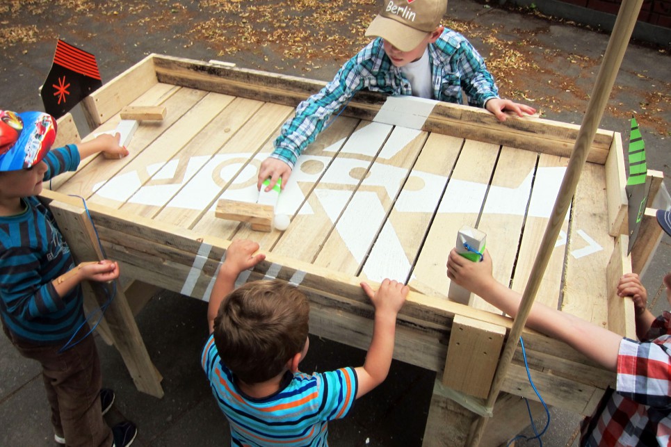 EMMA* ist ein mobiler Aktivator in Form einer fahrbaren langen Tafel mit verschiedenen zusätzlichen Funktionen – vom mobilen Planungsbüro zur Werkstatt, über die Torwand bis zur Küche. Sie kann in kurzer Zeit aus alten Paletten oder Ähnlichem gebaut werden und lässt sich nach Bedarf erweitern und für unterschiedliche Nutzungen optimieren.