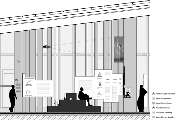 Gehe ich um die Struktur herum, kann ich mein Wissen über die Geschichte des Berges anhand von Exponaten und Schautafeln vertiefen. Gehe ich in sie hinein, sehe ich in der Mitte eine geräumige Bank: ein Modell des Berges. Erschöpft vom Bergwandern kann ich mich hier ausruhen und dabei den Kern der Ausstellung zu den erneuerbaren Energien betrachten. Hier wird mit Projektionen und Videos Wissen vermittelt, Relationen werden erläutert und Maßstäbe erklärt.