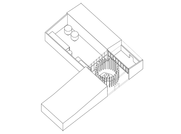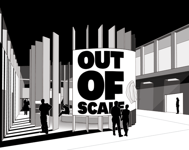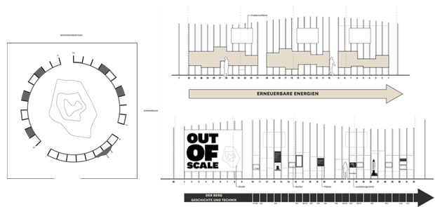 Beim Abstieg bemerke ich, dass sich die Skalen der Treppe bis zum Eingang eines Gebäudes fortsetzen. Betrete ich das Gebäude, muss ich den Blick heben, um die ganze Schrift zu lesen: Out of Scale steht dort im Windfang, der Titel der Ausstellung. Daneben hängt das Modell des Energiebergs und eine Tafel mit dem Glossar. Ich stehe vor einer technisch anmutenden kreisförmigen Struktur, die bis zur Decke des Raumes heraufwächst: wie ein Ausschnitt aus dem Sockel eines Windrads. Zwischen den Tafeln und Schaukästen kann ich immer wieder durch die Struktur hindurch bis tief in die Maschinenhalle hineinblicken.