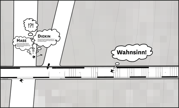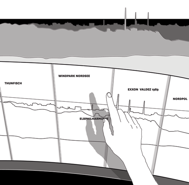 Der Horizontweg ist die Besucherattraktion, von hier kann ich den Blick über Hamburg und Wilhelmsburg schweifen lassen. An vier Stellen verbreitert sich dieser Weg. Hier stehen Informationstafeln. Die Tafeln sind in einem flachen Winkel am Geländer befestigt und erinnern an Bergpanoramen in den Alpen. Die Bergpanoramen benennen Orte, die ich sehen kann, wie auch Orte, die in dieser Richtung liegen und die ich nicht sehen kann, die thematisch jedoch relevant sind. Wieder springt der Maßstab und regt dazu an, über Verhältnismäßigkeiten nachzudenken.