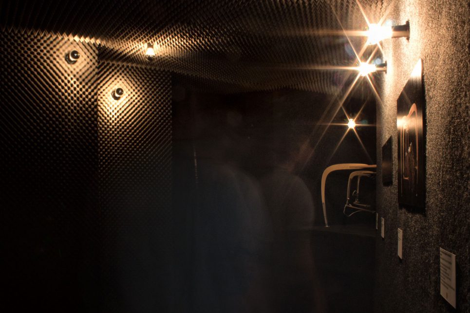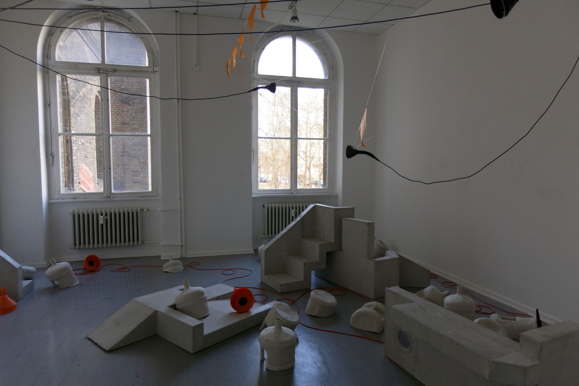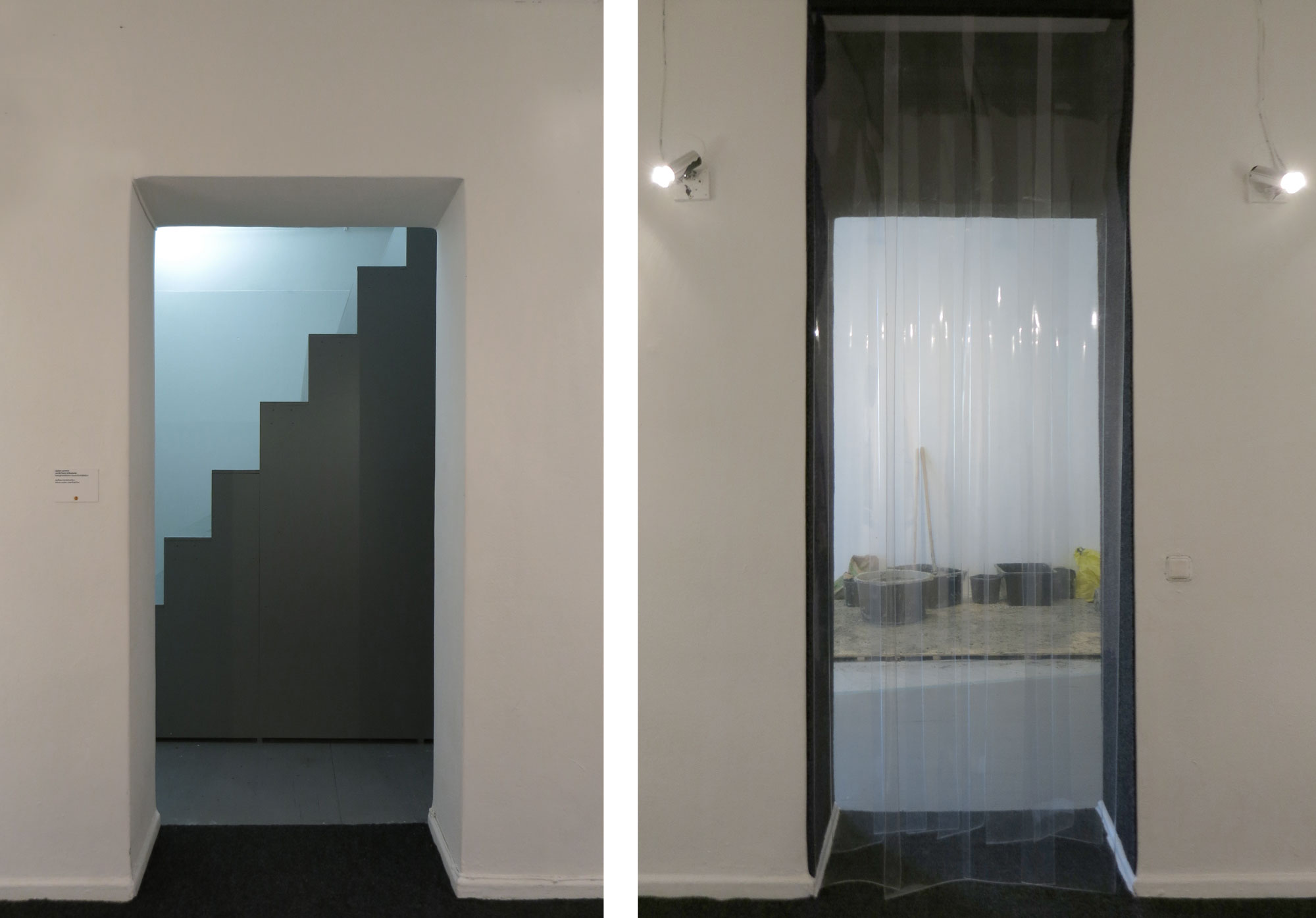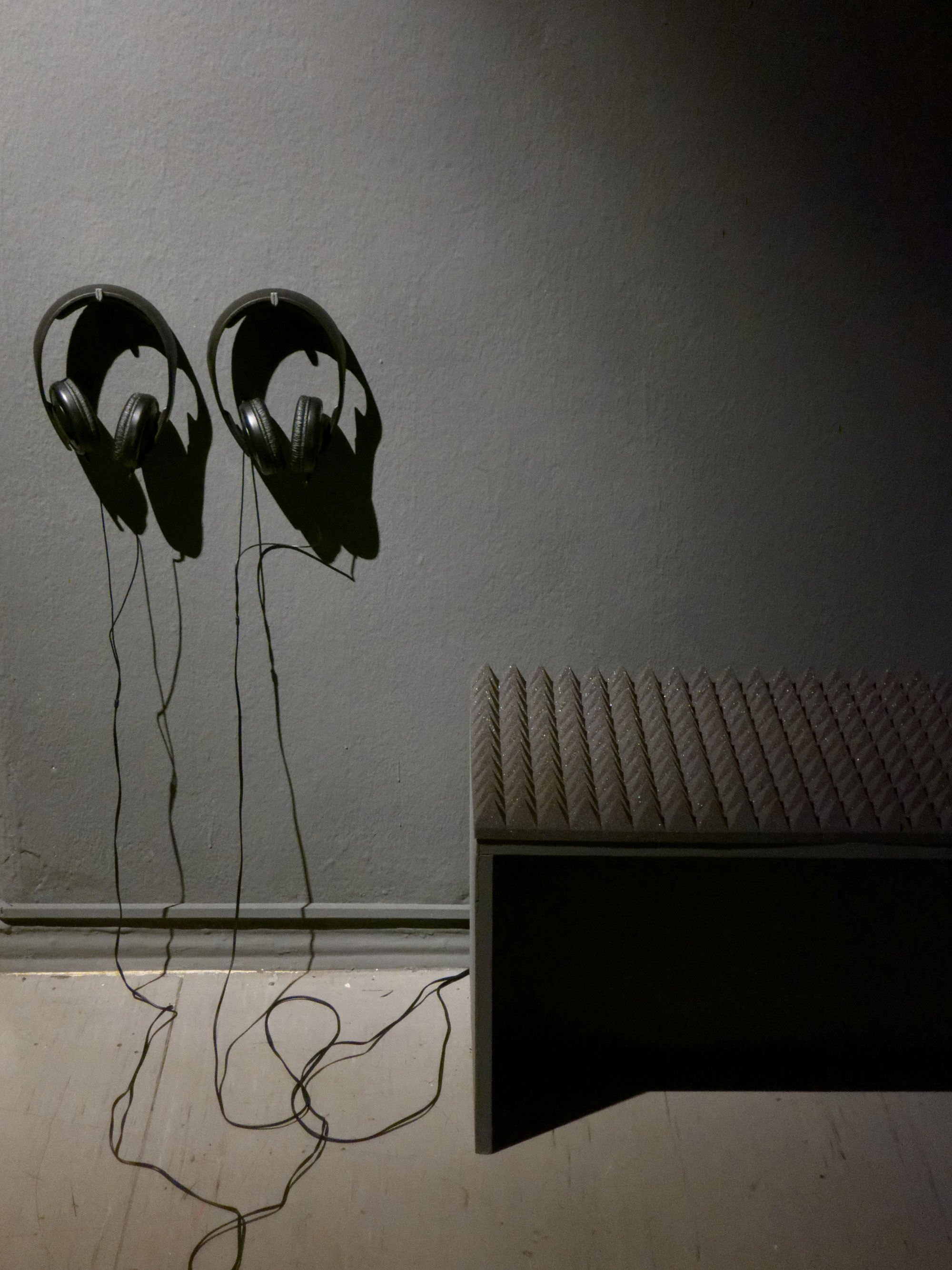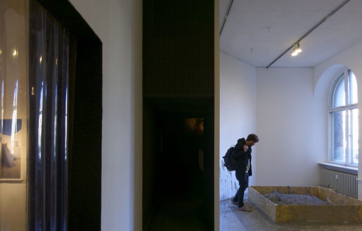 Das Konzept der szenischen Gestaltung der Ausstellung besteht darin architektonische Elemente einzuführen, die sehr unterschiedliche räumliche Erfahrungen generieren, dennoch eine einheitliche Ästhetik vertreten und in der Lage sind, die einzelnen Kunstwerke akustisch voneinander zu trennen. Hierzu haben wir die Räume des Kunstraum Kreuzberg um zusätzliche Zwischenräume ergänzt, die vorhandene Situationen aufgreifen und fortführen und dadurch die Wahrnehmung der bestehenden Architektur ändern. Diese Zwischenräume dienen als akustische Schleusen und schaffen durch gedimmtes Licht und weiche, dämmende Materialien an den Böden, Wänden und Decken Ruheräume, die durchschritten werden müssen bevor sich die einzelnen Kunstwerke zeigen.