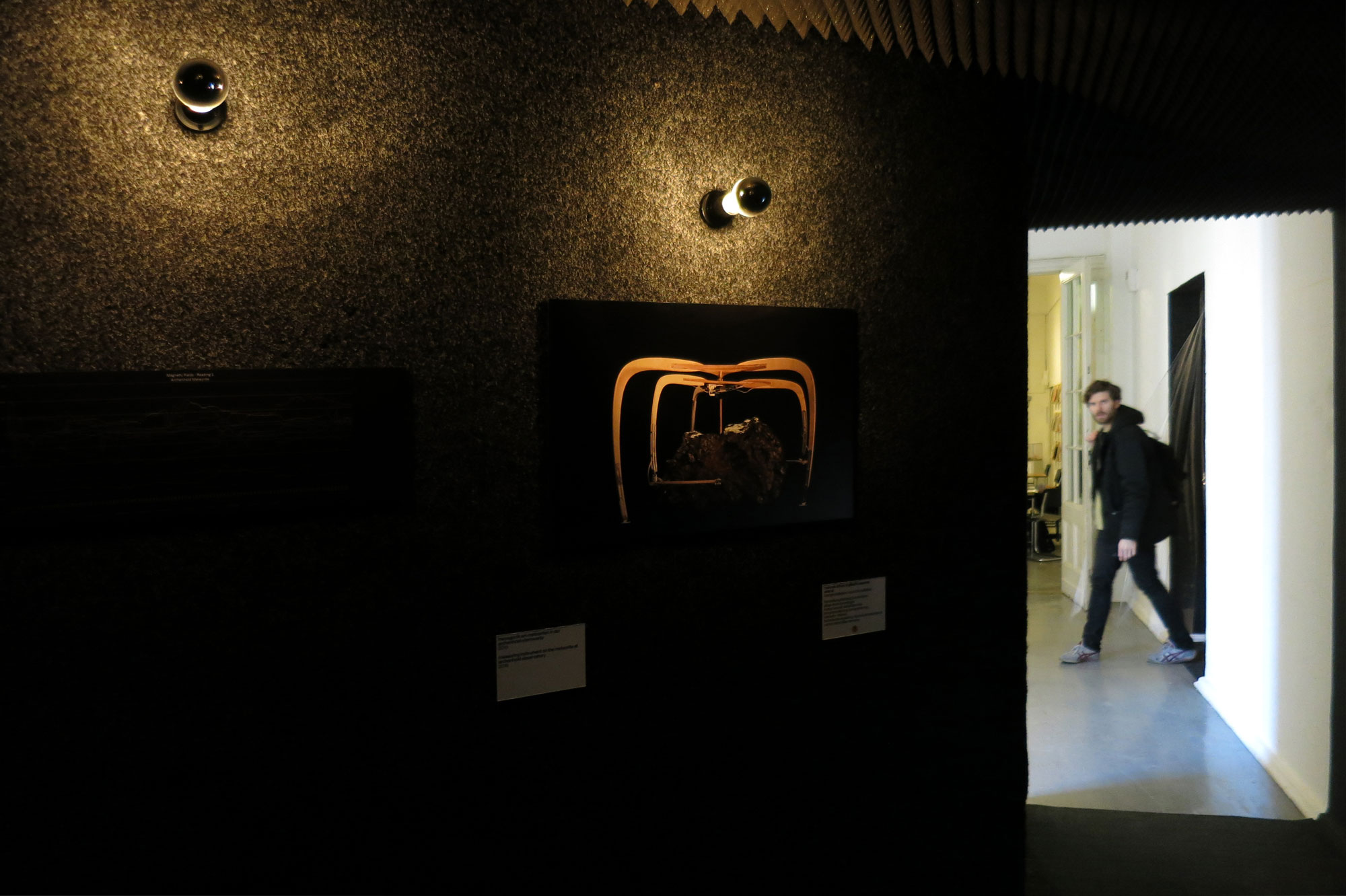 The concept of the exhibition design is to bring in elements which can diminish sounds, and at the same time contribute, to an atmosphere that alternates between spatial experiences. We try to enhance the existing space by adding elements that change the perception of the original architecture . Dense and enclosed tunnels are a significant part of the scenography and with soft material coated surfaces on ceiling, floor and wall we create a vacuum of silence and soft walking paths . The art pieces reveal themselves behind the build in elements that consists of heavy curtains and walk-in tunnels. The sound-absorbing materials give the space an identity and the dimlitted light bulps emphasizes the texture of the materials.