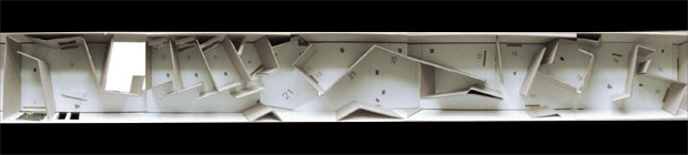 „god’s view“ der ausstellungsarchitektur – der blick in s modell. zugang über die beiden türen links unten im modell. die komplexe geometrie und die parallele wegführung erlauben ein immersives raumerlebnis. der raum begibt sich damit in weit gefasste analogie zu den gezeigten künstlerischen arbeiten.