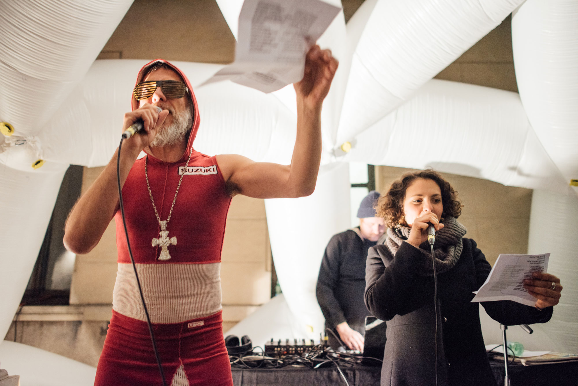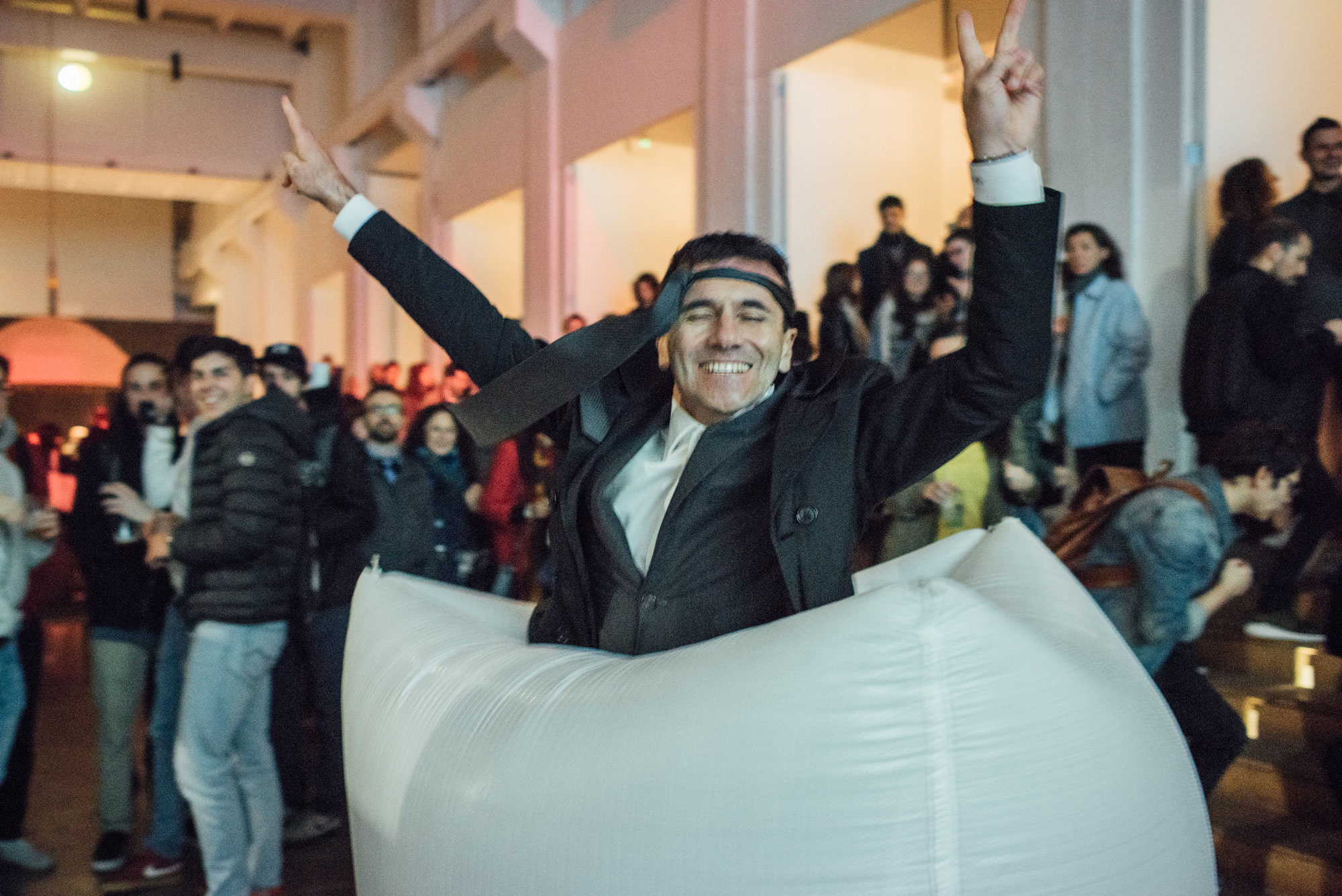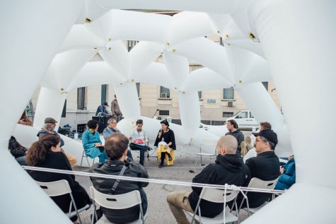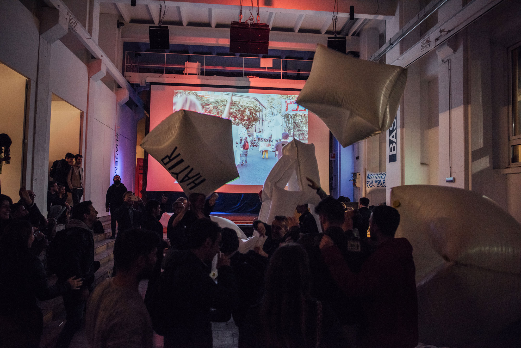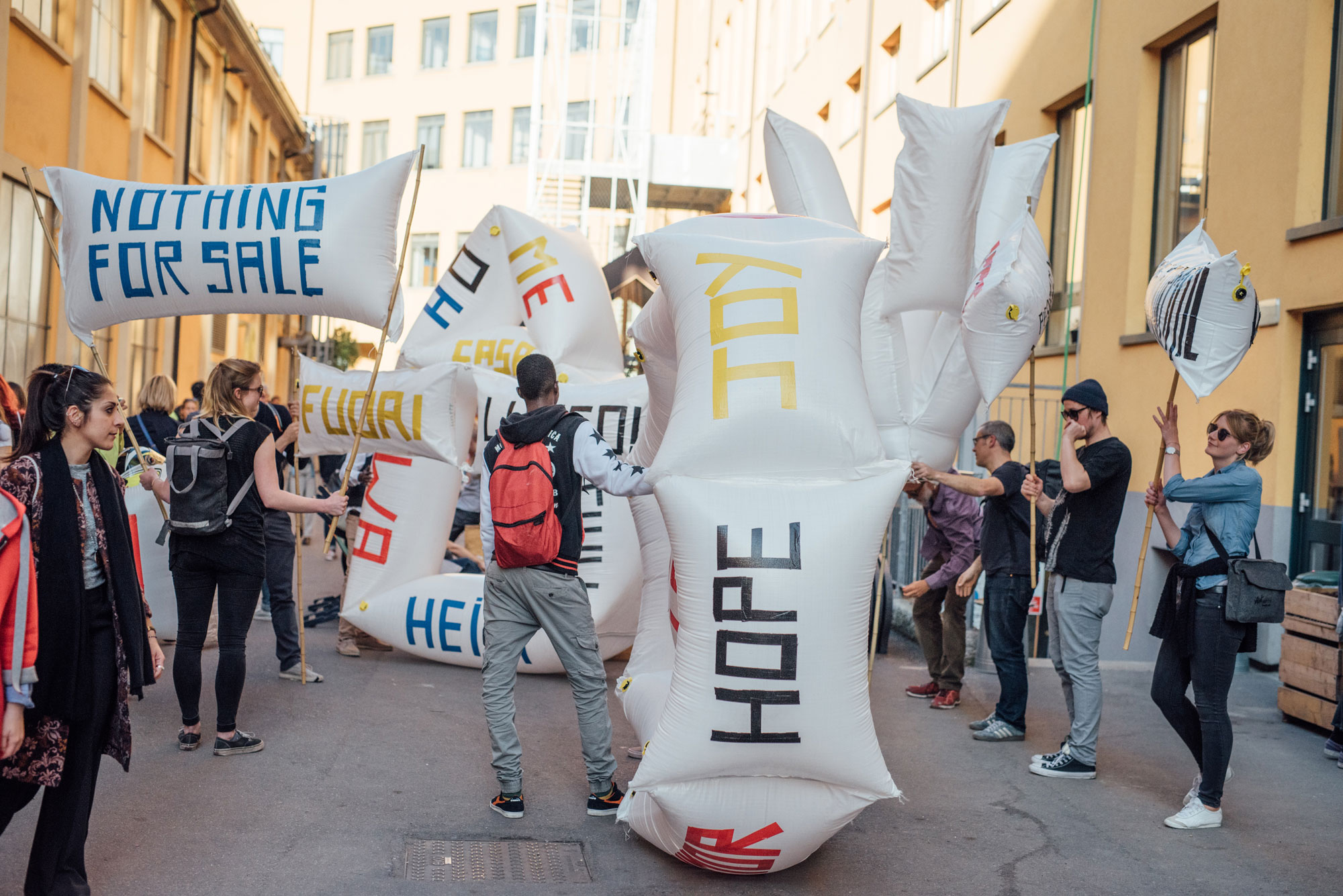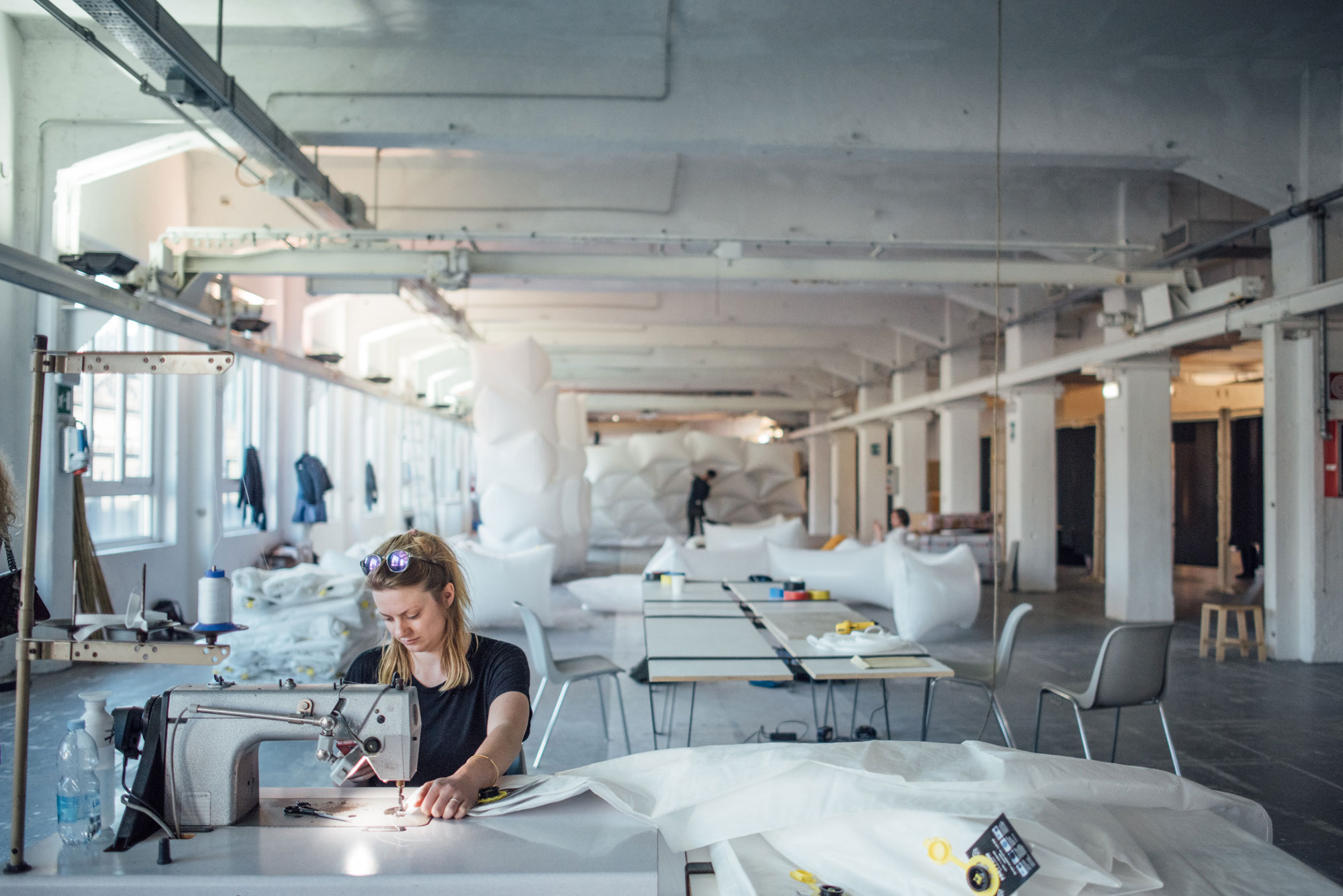 During the first week of April 2017, in the framework of the Fuorisalone in Milano, raumlabor will set up a laboratory for design, experimentation and production of pneumatic microarchitectures. The base element is a ready-made product, an air cushion, used normally as dunnage bag, for securing loads in containers or ship loads. By sewing and tying together the single elements, different microarchitectures will emerge and will be further tuned to carry the individual expressions of several local activist groups in the public space.