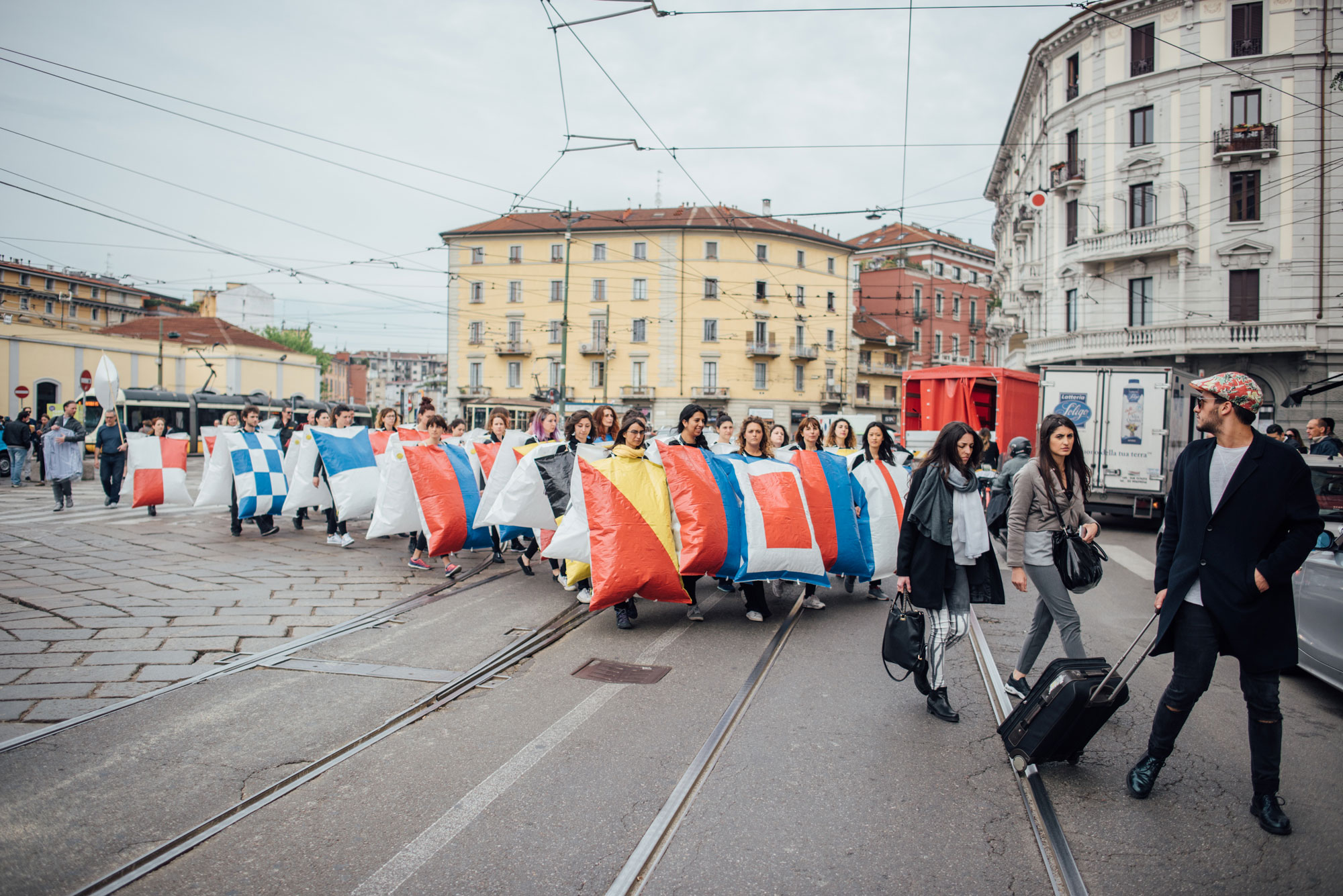 With the help of the International Code of Signals Mare Nostrum seeks to develop and to inform the message with a connotative and a denotative value in a framework of meaning that seeks to address social problems. In this case the semiotics is constructed through the juxtaposition of ponchos/flags of different colors that, through the acts of the performers wearing them, form keywords such as “work”, “refugee”, “nature”, “welcome”, “poetry”, and interact with the surrounding space and the figures that are generated.