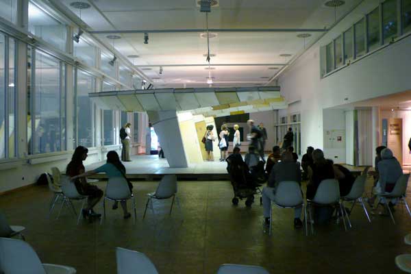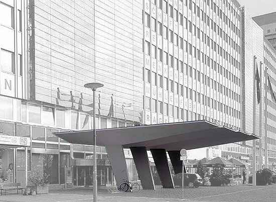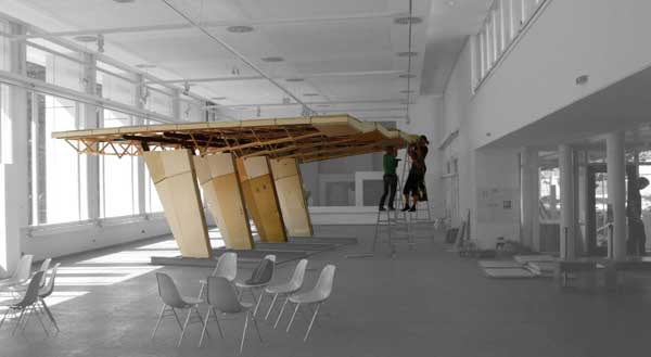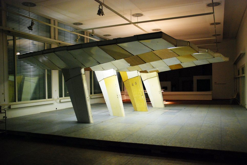 Questioning this practice, raumlabor in collaborations with students from Bauhaus Universität Weimar will build a 1:2 replica of the canope of the “Haus der Elektroindustrie”, located on Alexanderplatz 1-5. The building material originates from the same period as the object replicated: doors taken from demolished apartments in Halle-Neustadt, one of the four mayor urban developments of the early GDR, now under transformation as a so-called “shrinking city”.