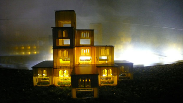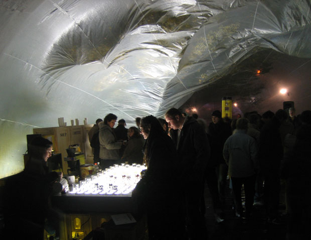 Auf Einladung des „GLOW“ Festivals, baut raumlabor gemeinsam mit plastique-fantastique und in Kooperation mit dem Designhaus-Eindhoven, die „GLOW-Lounge“ als Zentrum des Festivals, ein Lichtobjekt aus 600 Getränkekisten.Einzigartig in den Niederlanden präsentiert sich GLOW: Forum of Light in Art and Architecture dieses Jahr zum dritten Mal erfolgreich im Zentrum Eindhovens. Als Schnittstelle zum öffentlichen Raum, auf einer Verkehrsinsel zwischen PSV-Stadion und Phillips-Zentrale platzierten wir das Festivalzentrum. Die Transformation des Ortes, die pneumatische Raumhülle bietet im Inneren Raum für Konzerte, spontane Lesungen sowie Performance und DJ-Auftritte. Zu Gast unter anderem Moxx (NL) und Silas Bieri (illeist CH). Catering Konzept Designhuis Eindhoven.