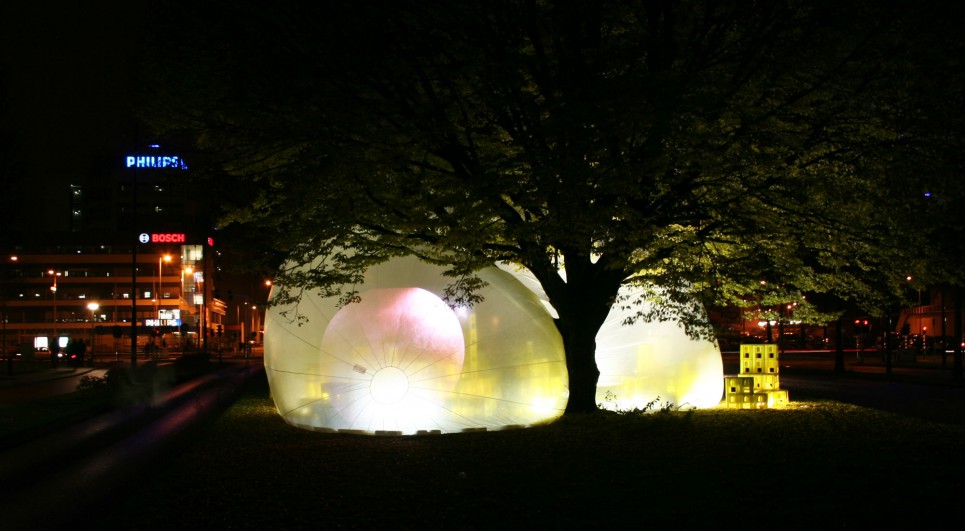 Invited by the „GLOW“ festival, raumlabor designed together with plastique-fantastique in cooperation with Designhuis-Eindhoven, the „GLOW-Lounge“ festival centre. A light object out of 600 crates. Unique in the Netherlands, for the third successive time the center of Eindhoven is the stage and podium for „GLOW: Forum of Light in Art and Architecture“. We placed the center, a gateway to the public space, in the middle of an pedestrian refuge island between the PSV-Stadium and the headquarter of the Phillips company. The transformation of the site, the pneumatic spatial mantle gives up space for concerts, spontaneous readings as soon as performance and dj-appearance. Guests like Moxxs (NL) and Silas Bieri (illeist, CH). Catering concept by Designhuis-Eindhoven.