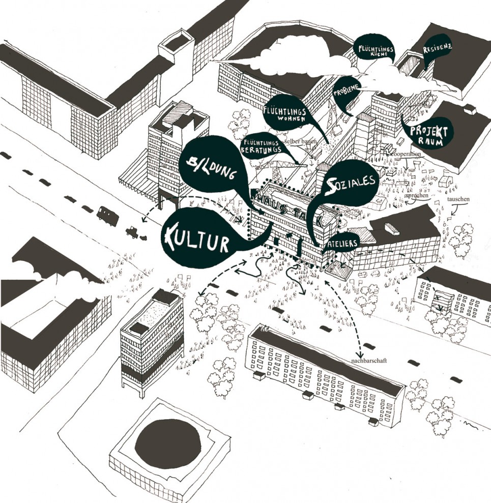 Aus Anlass eines Workshopverfahrens des Berliner Senats zur städtebaulichen Neubewertung des Alexanderplatz hat sich eine Gruppe von verschiedenen Berliner Initiativen gebildet, die ein Konzept für eine Nutzung des leerstehenden, ehemaligen ‚Haus der Statistik‘ entwickelt hat: Die verschiedenen Gebäudeelemente werden auf Basis einer soliden baulichen Substanz in Wohnraum für Flüchtlinge und Arbeitsräume für Kunst, Kultur und Bildung kosteneffektiv umgewandelt. Über Begegnungsflächen, Co-Wohn- und Co-Working Konzepte entstehen wechselseitige, integrative Synergien zwischen den Beteiligten und der Nachbarschaft. Das Haus wird zu einem Prototypen für eine innovative, integrative Praxis in Verbindung von Kultur, Bildung und Sozialem.