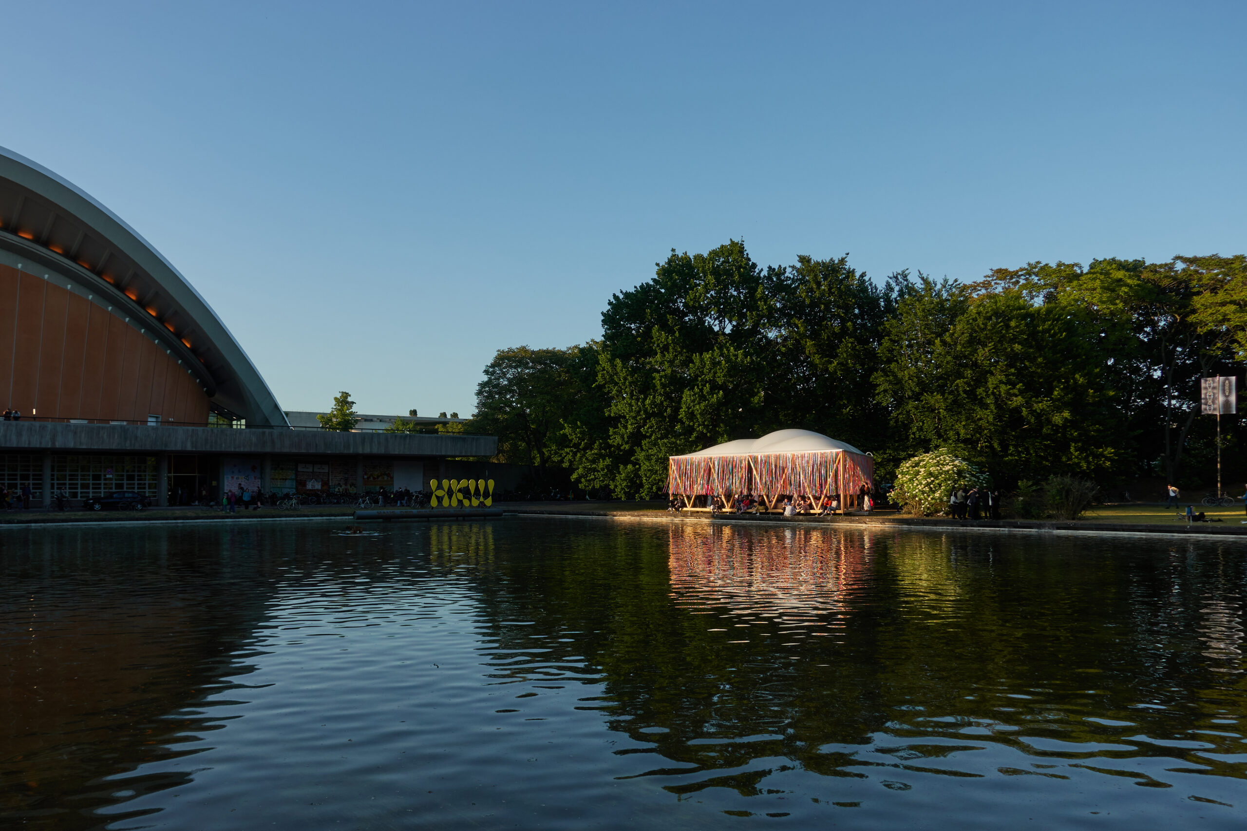 Zur Wiedereröffnung vom Haus der Kulturen der Welt HKW im Berliner Tiergarten stellt das neue Team eine jährliche Serie von Pavillons vor. Als Ort für spontane Begegnungen im Park sowie als Plattform für geplante Veranstaltungen und Gespräche aktiviert der Pavilion die Außenflächen vor dem HKW. Auf der öffentlichen Rasenfläche vor dem Museum bietet der dreieckige Pavillon den BesucherInnen offenen Zugang von allen Seiten.