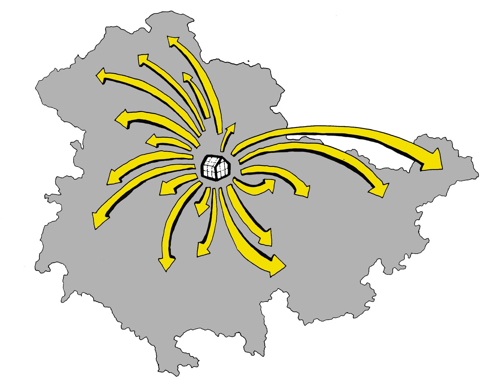 Gibt es aber heutzutage noch eine klare Trennung von ländlichen und städtischen Strukturen? Das Land ist heute ein Produktionsgebiet für Energie-, und Agrarwirtschaft und durch den technologischen Fortschritt teilweise in eine Art Maschine umgewandelt. Gleichzeitig ist der Wunsch nach Natur mehr und mehr in der Stadt spürbar. Die Strukturen verschmelzen ineinander und es entsteht ein hybrider Raum. Besonders stark von dieser Entwicklung sind Räume mit einer homogenen Dichte betroffen, wie eben Thüringen.
