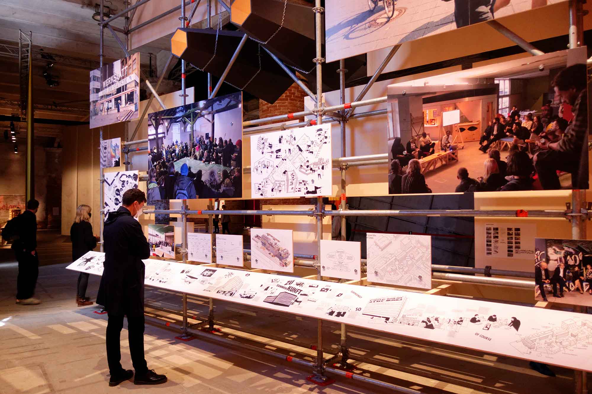 Unsere Installation im Arsenale nimmt Bezug auf die Architektur der Floating University 2018 mit Gerüst und Bubble Room. In der Ausstellung wird das Gerüst zum Träger von Bildern und Grafiken aus beiden Kontexten: eine Seite erzählt die Geschichte der Floating, die andere Seite die vom Haus der Statistik. Die Schlüsselgrafik auf jeder Seite ist ein Zeitstrahl, der die Kooperationen, Netzwerke und Ereignisse zeigt und so den Momentaufnahmen drüber einen Kontext gibt.