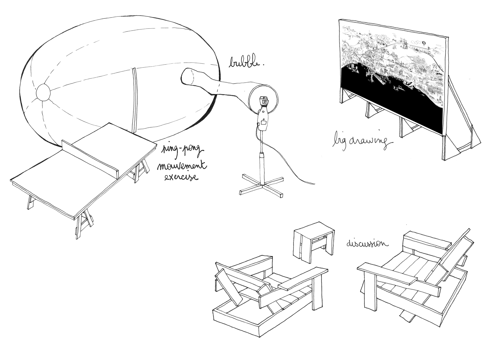 At the end of the building workshop, a lot of people from different backgrounds came to the opening of the „Institute of visionaries“. All the built elements were brought to the train station to making the space manifest and allowing people to meet and discuss around fire, open their imagination while standing in front of the big drawing, or process some ideas by moving their body in the inflatable ping-pong space.