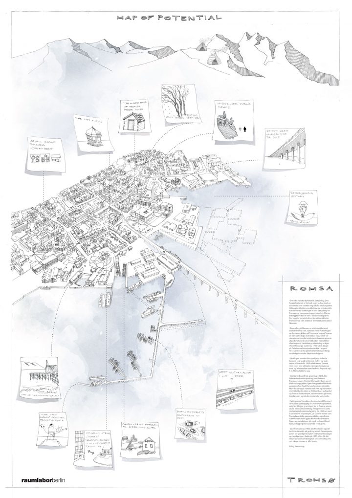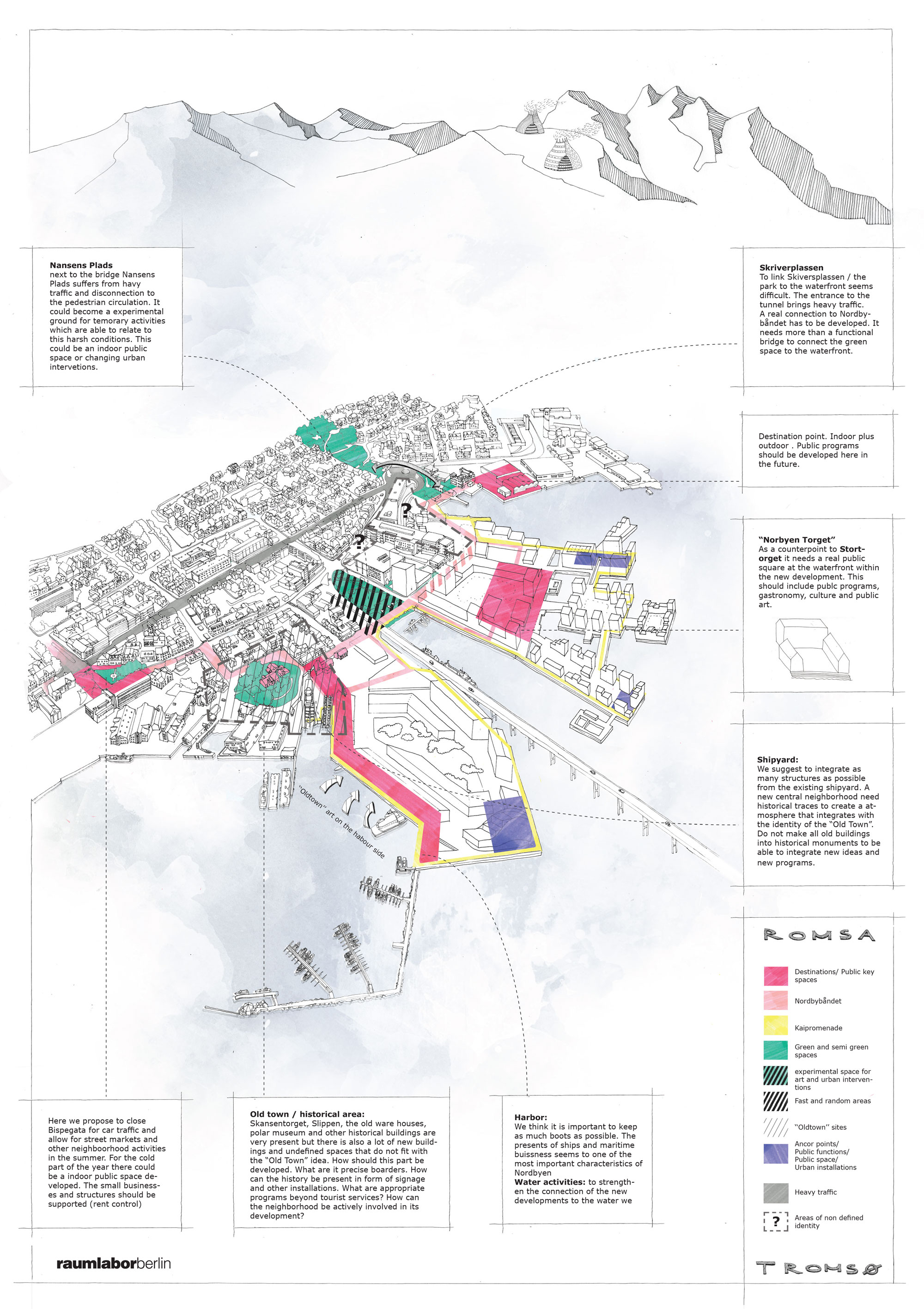 raumlaborberlin has been invited by the cultural and planning department of Tromsø to design a public space in connection with possible future art and urban interventions. We are interested in the city as a space of activity: urban identity arises from inhabitants‘ relationship to their environment. The project aims to define specific qualities and programs for new public spaces in Nordbyen and proposes locations and themes for urban interventions and public art.