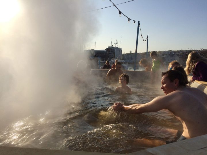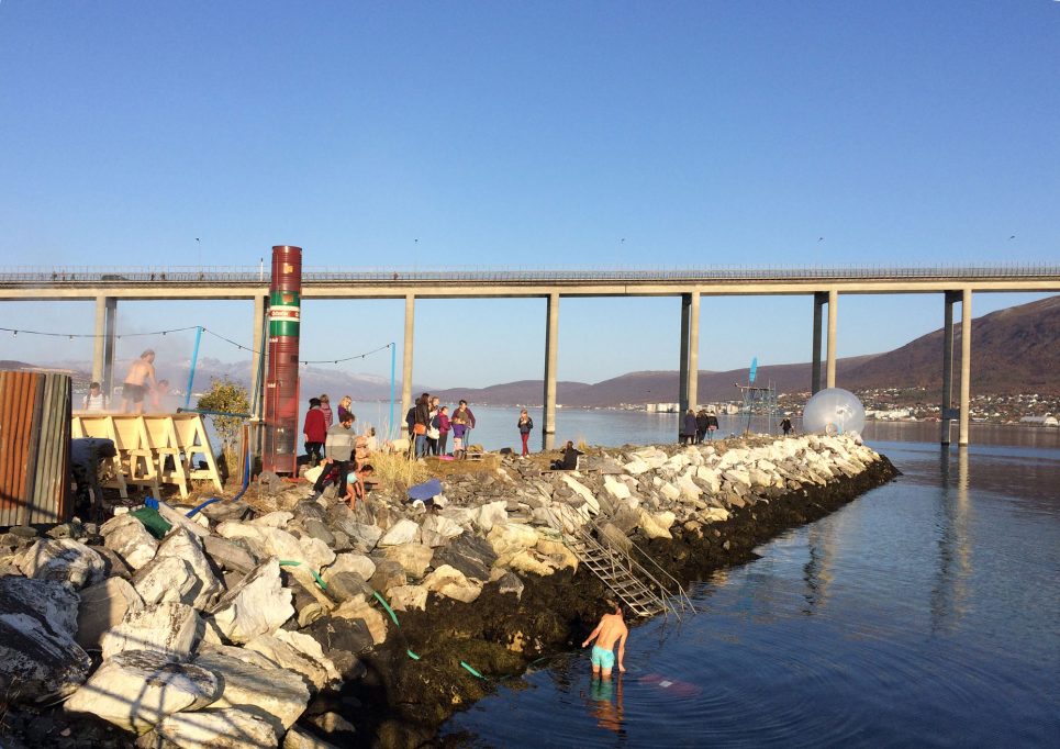 raumlaborberlin designed and, in collaboration with local residents, built a public bath on the pier of the old shipyard in Nordbyen, Tromsø. The workshop intended to discuss and test new non-commercial social programs for the future of Nordbyen. The pier, being the future edge of new city development, holds significant symbolic value in this regard. In addition to the hot bath, the pier featured a viewing platform and inflatable bubble that served as a space for relaxing.