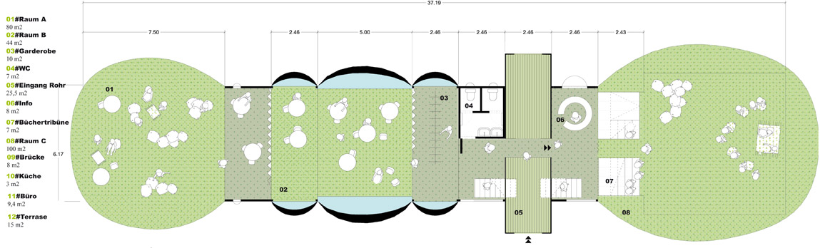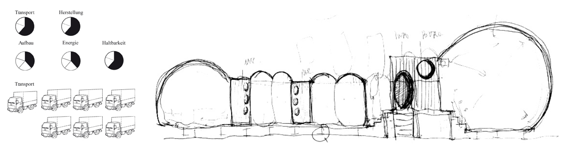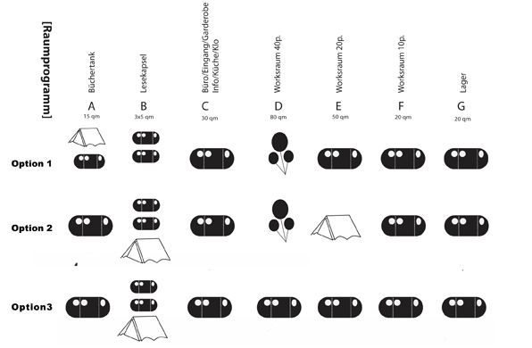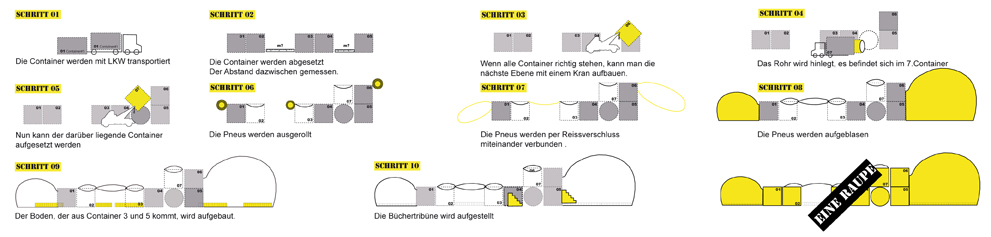 Nach intensivem Abwägen der Vor und Nachteile der einzelnen Entwurfsvarianten haben wir nach einer Lösung gesucht, die >the best of all worlds< vereint. Eine Lösung die in einer erträglichen Zeit auf- und abgebaut werden kann, deren Transportaufwand so gering wie möglich ist, deren Herstellungskosten beim Bau nicht explodieren werden und die trotz allem Pragmatismus eine Vielfalt an Räumen beinhaltet die nach innen wie nach aussen dem einzigartigem Angebot des Kinderliteraturhauses gerecht wird. Das Ergebnis heisst >Die Raupe<.