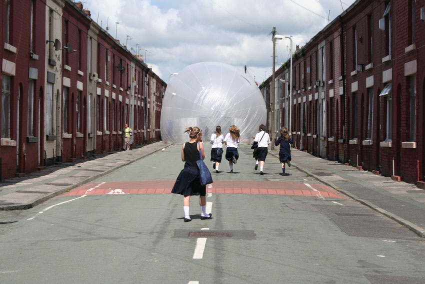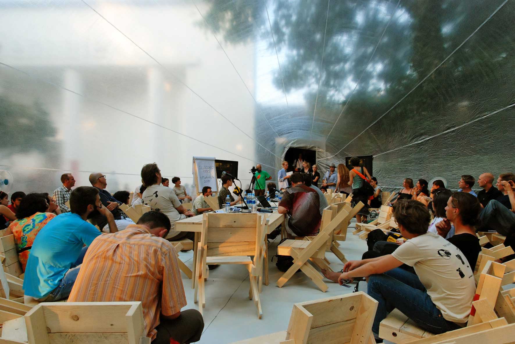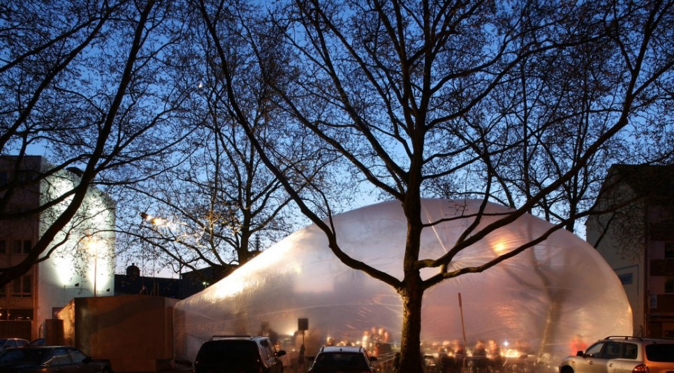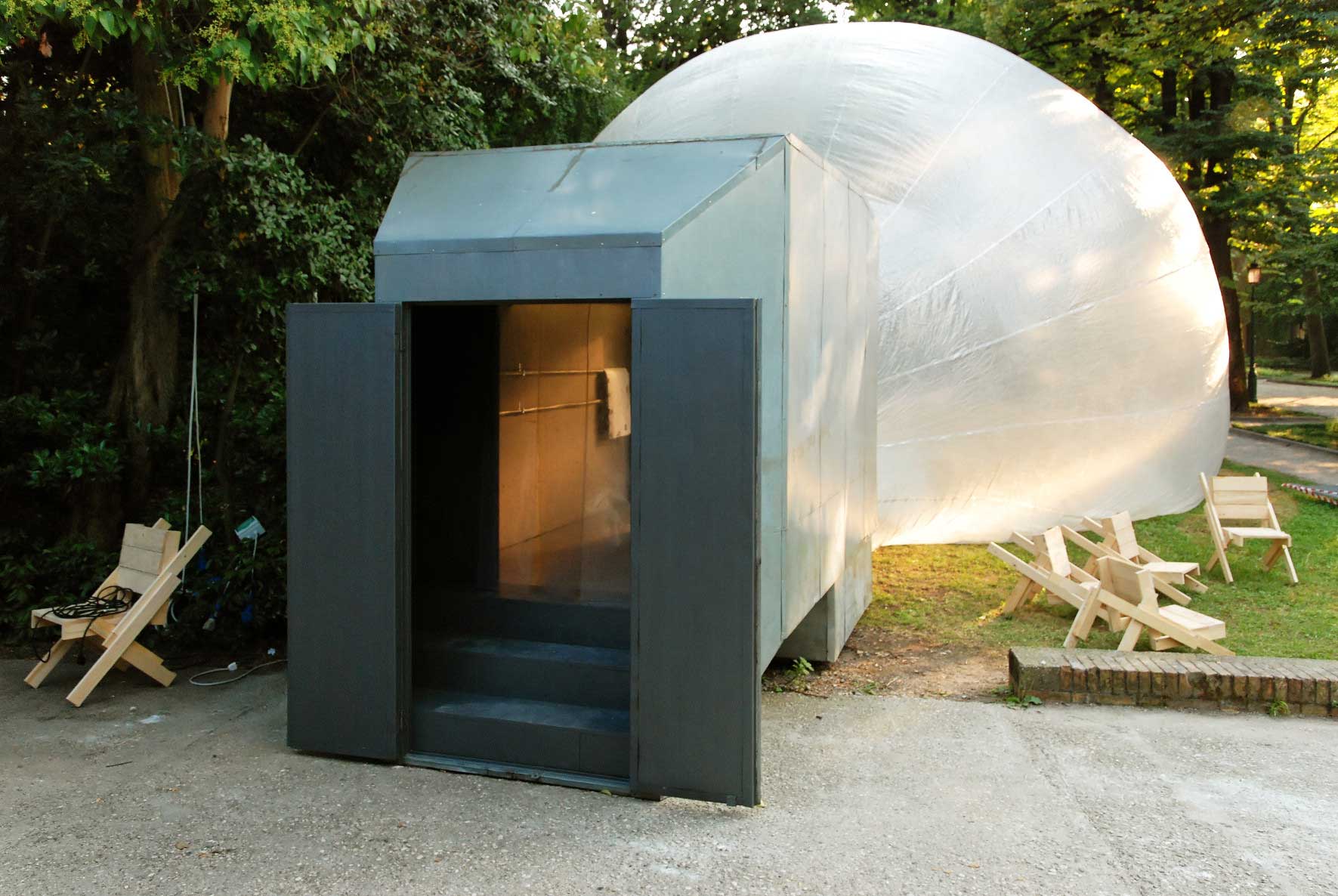 The Kitchen Monument is a mobile sculpture which has two states of being. This zinc sheetclad sculpture can be extended into public space by a pneumatic spatial mantle that transforms it into a temporary collective space. Different programmes are staged in different places. Its broad spectrum of uses includes a banquet hall, conference room, cinema, concert hall, ballroom, dormitory, boxing arena and steam bath.