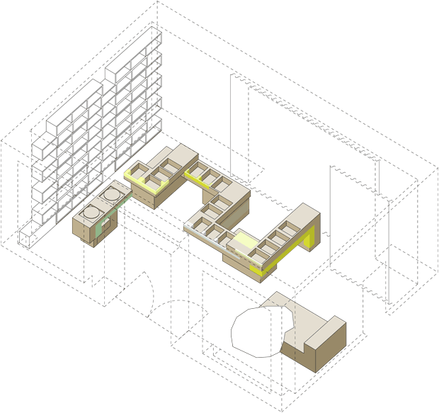 „Leila M.“ ist ein Plattenladen, Veranstaltungsort und Treffpunkt für experimentelle Musik in Berlin-Mitte. Die Betreiber Mathias Gordon und Alexander Scholze kannten unsere „Espressobar“ in Halle-Neustadt und wollten ihre Ladeneinrichtung ebenfalls aus recycelten Plattenbautüren bauen. Der Raum teilt sich in drei große Elemente: ein hohes Regal als Lager, ein durch den Raum gefaltetes Möbelband als Verkaufstheke und ein DJ-Pult als Hörstation. Boden, Decke und Wände bleiben unbehandelt, Farbflächen fassen den Raum neu.