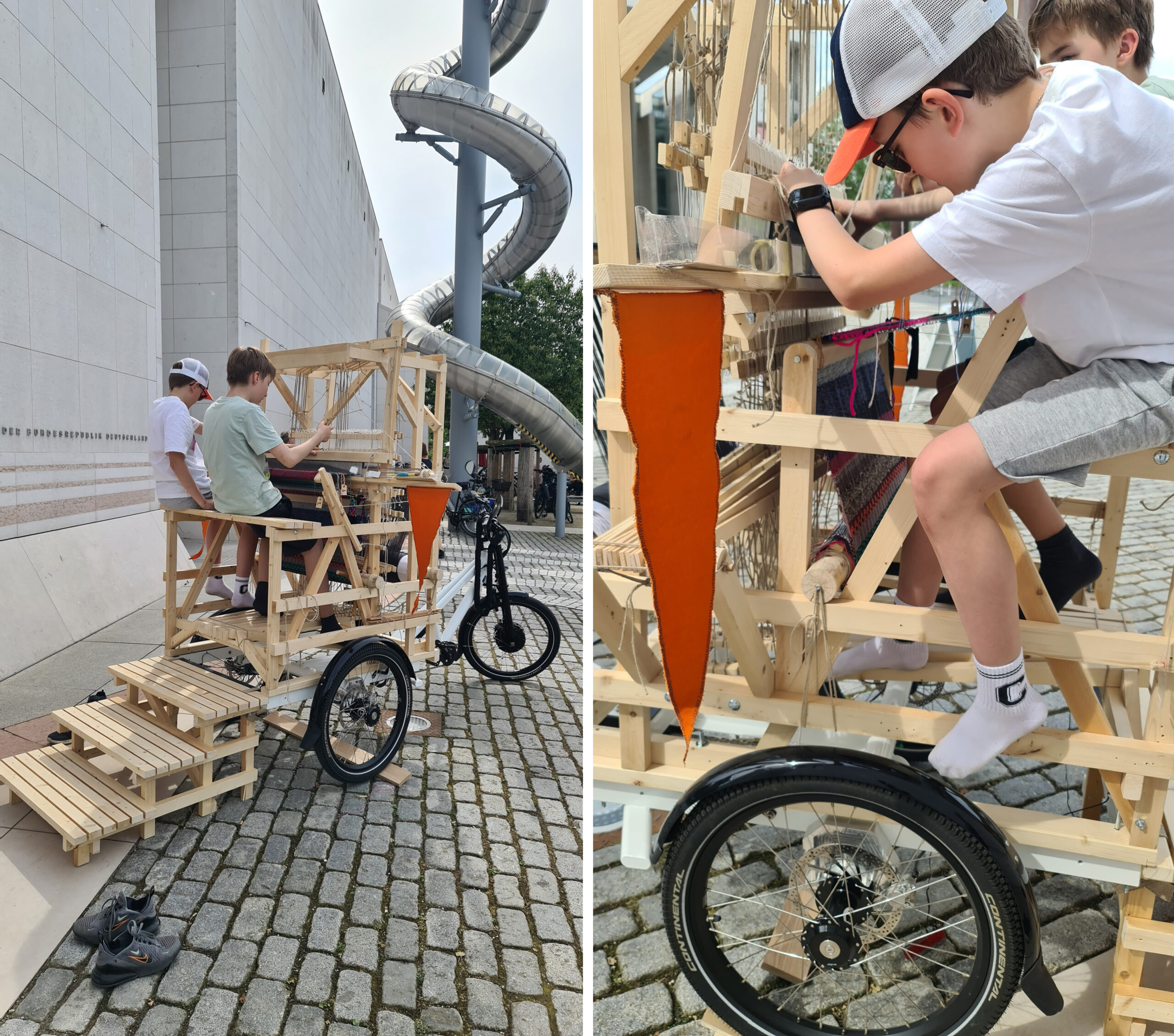 Der Webstuhl, interpretiert und gebaut nach dem Plan von Andreas Möller, Weberei Hamburg, hat in diesem Fall Räder, einen Elektromotor und sogar eine Strassenverkehrszulassung.