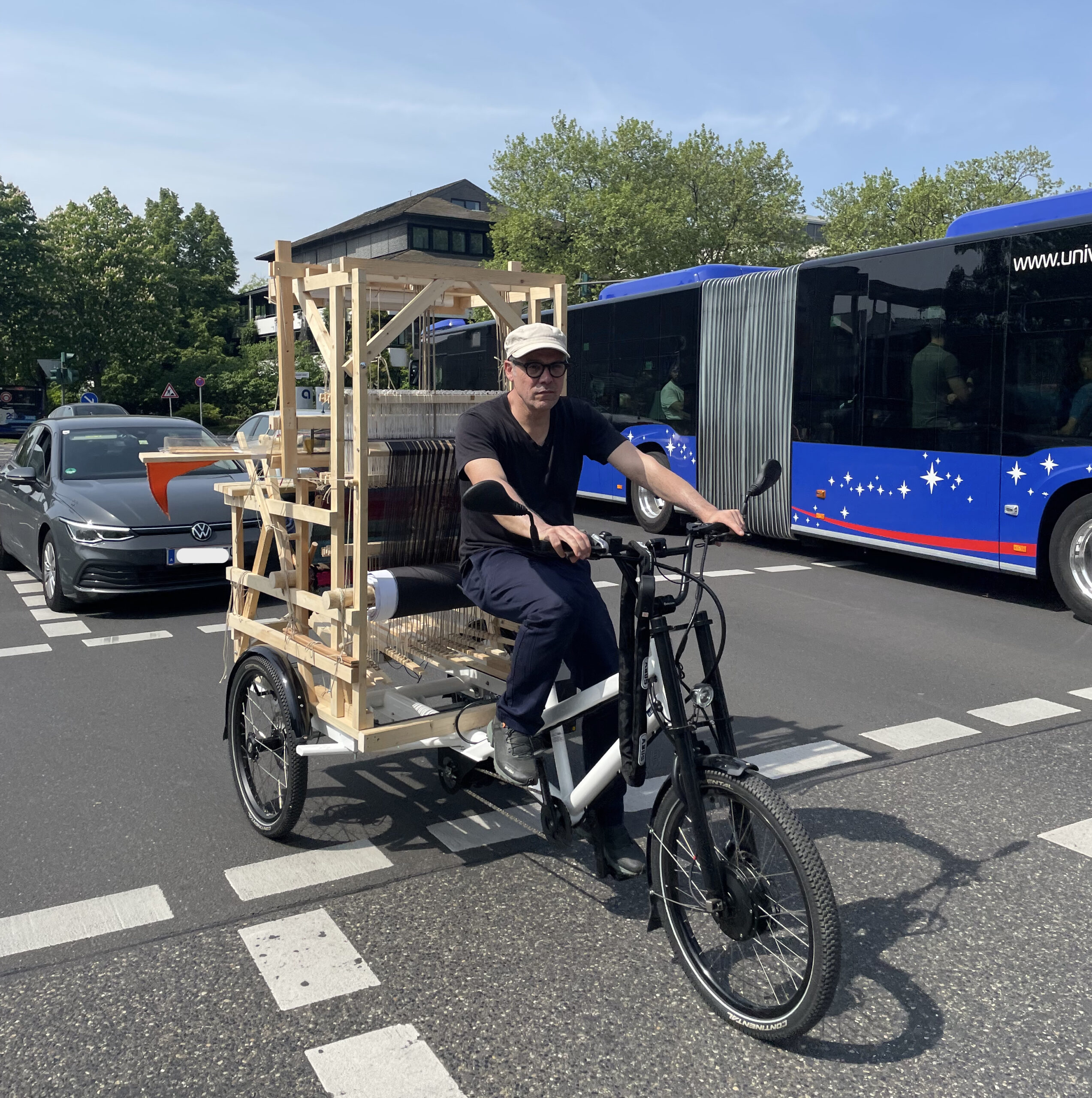 The loom, interpreted and built according to the construction plan of the weaver Andreas Möller, in this iteration has wheels, an electric motor and even a road traffic licence.