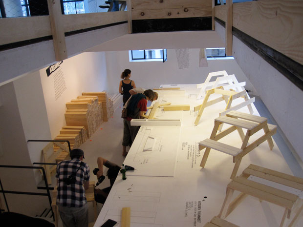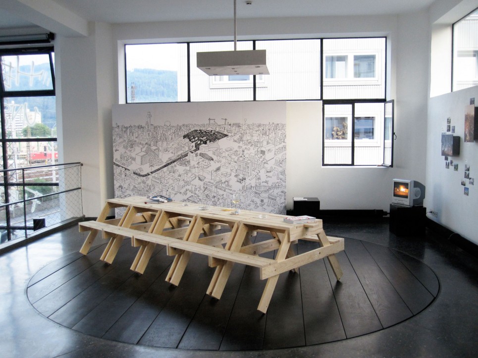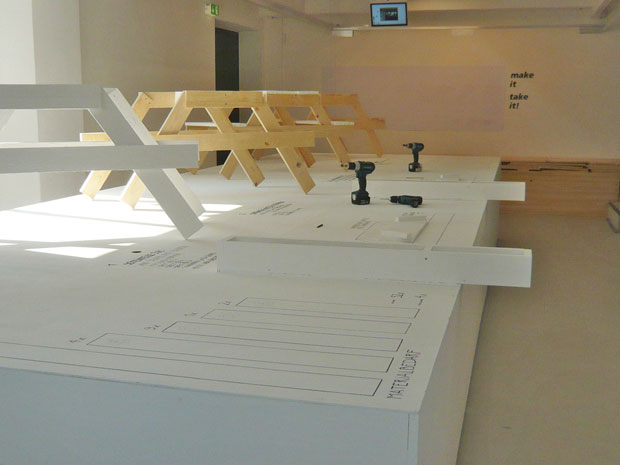 In Innsbruck raumlabor gives a framework, but leaves space for participation and individualization. The „Biergarnitur für Tirol“, a communicative furniture is a guide for an opportunity for a dialogue. Tools and wood are provided. The process depends on the participation and motivation of the visitor. The usage of the Biergarnitur is not given but the visitor is invited to transform and to bring the built furniture into context.