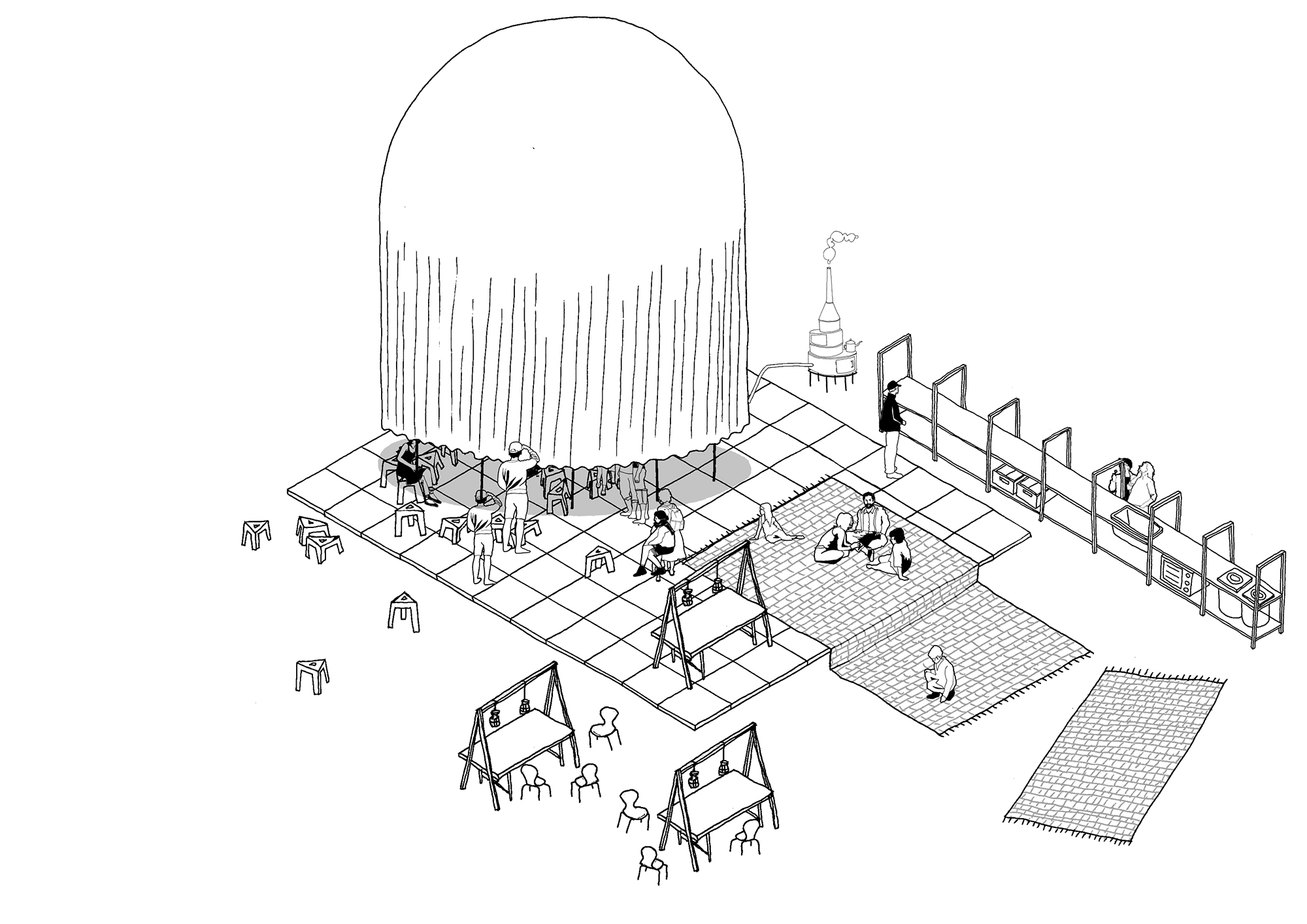 Für dieses Format entwickelt raumlabor ein performatives, räumliches Setting, mit dem die Freifläche neben dem Eiermannbau – und je nach Witterung auch der Eiermannbau selbst – situativ bespielt werden kann und einen starken atmosphärischen Rahmen schafft.