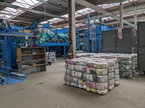 TEXAID betreibt am Standort Apolda eine der größten Altkleider-Sortieranlagen Deutschlands. Täglich werden dort in einem dreistufigen Prozess ca. 350.000 Kleidungsstücke von Hand in rund 300 Kategorien sortiert. Aus der Kategorie Jeans hat uns TEXAID 400kg Hosen zur Verfügung gestellt, aus welchen wir mit der Teilnahme von Besucher*innen der Foren einen kreisrunden Teppich geknüpft haben.