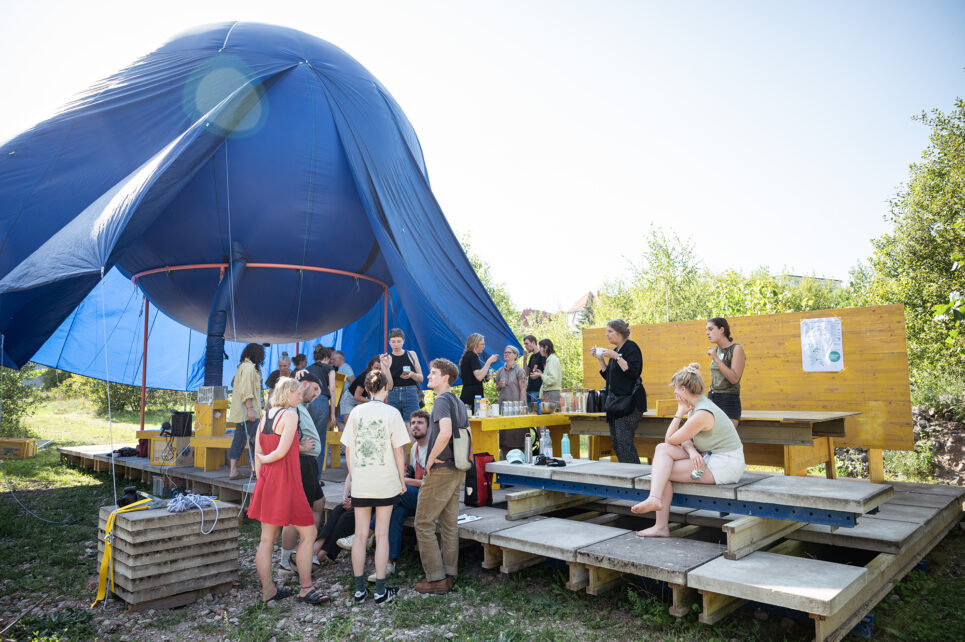 Die hier beschriebene Projekterzählung setzt den Fokus bis zu diesem Punkt auf die technischen und praktischen Aspekte der Umsetzung des Projekts. Der thematische Diskurs hin zu einer Nachhaltigen Zukunftsvision dreht sich jedoch auch intensiv um das Verhältnis von Mensch und Natur, beziehungsweise eben gerade der Überwindung von der in unserer westlichen Kultur historisch gewachsenen Einstellung der Hoheit der Menschen gegenüber der Natur. Diese erforderliche Neueinstellung stammt von der Überzeugung, dass wir als Gesellschaft nur zu nachhaltigeren Formen des Lebens finden können, wenn wir uns als Teil der Natur verstehen, ihr zuhören und mit ihr kooperieren. Vor diesem Hintergrund mochten wir den Aspekt, dass wir die Besucher*innen der Foren mitten auf der zu großen Teilen verwilderte Freifläche versammelten, der Ballon und der leichte Vorhang im Wind in Bewegung kamen, oder eben auch alles schnell, schnell abgebaut werden musste, falls Windböen aufkamen.