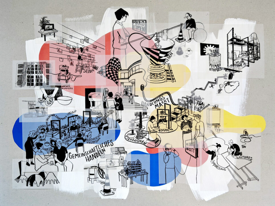 Gibt es so etwas wie ein offenes “Commons” – zu Deutsch die Allmende, das Gemeingut, das Gemeinwohl? Wer kümmert sich um die Gemeingüter, wer pflegt sie, lässt sie wachsen und ist gleichzeitig froh, das gepflegte zu teilen und zur Verfügung zu stellen? In raumlabors Projekten, manchmal “real utopias” genannt oder als Mikroutopien beschrieben, werden die Verhältnisse und Beziehungsgeflechte von uns untereinander und von uns zu Räumen, zu Vorstellungen neu aufgeladen und anders verknüpft. In solchen Aktionsknoten kommen viele Akteur*innen und Ideen zusammen und erzeugen eine Sphäre des Möglichen. Da es dennoch reale Situationen sind, die so anders verschaltet sind, kann durch das eigene Erleben die Frage mitgenommen werden, wie die sogenannte eigentliche Realität sich im Vergleich dazu anfühlt. raumlabor geht es dabei nicht um richtig oder falsch, es geht oft darum Potentiale zu entdecken, Möglichkeiten wertzuschätzen und ein gemeinschaftliches anders Handeln einzuüben.
