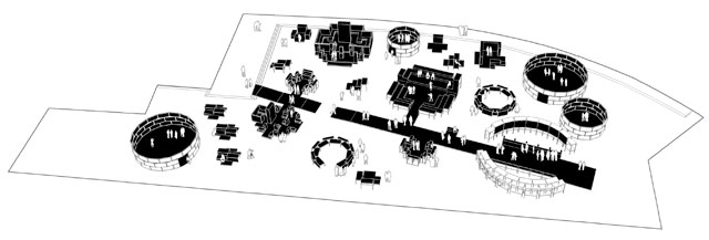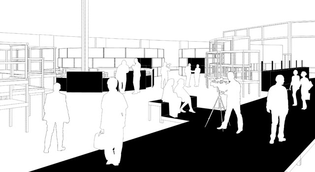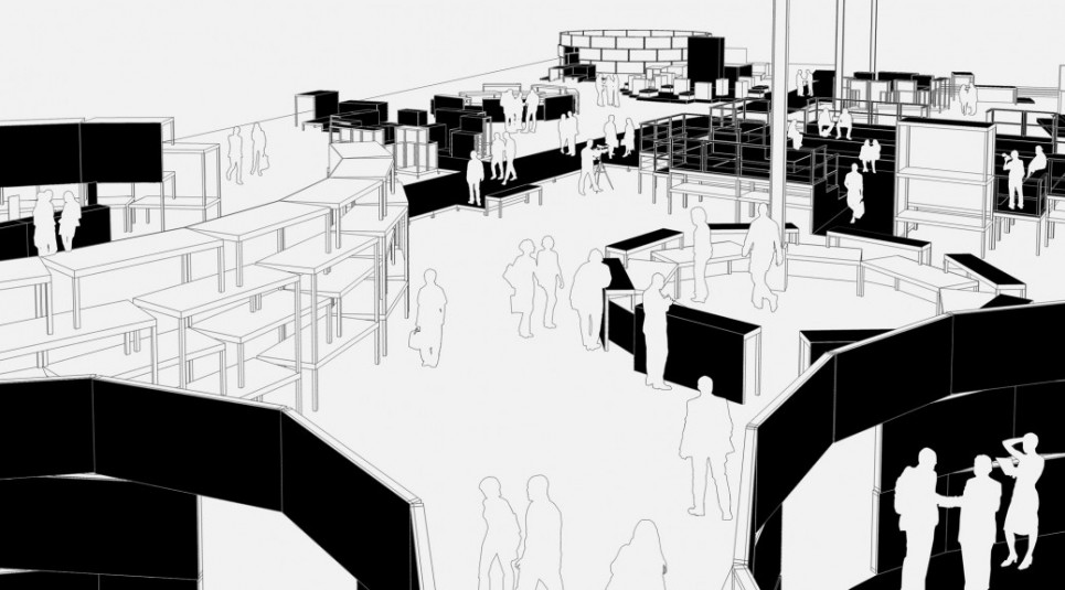 Um eine möglichst hohe Wiederverwendbarkeit und Flexibilität dieser temporären Installation zu erreichen, bedienen wir uns standardisierter Bühnenelemente als Basis-Baumaterial, die zu horizontalen Landschaften und fassähnlichen vertikalen Rundräumen zusammengebaut werden.