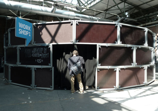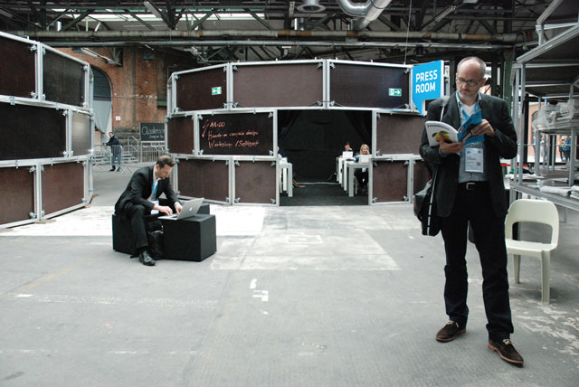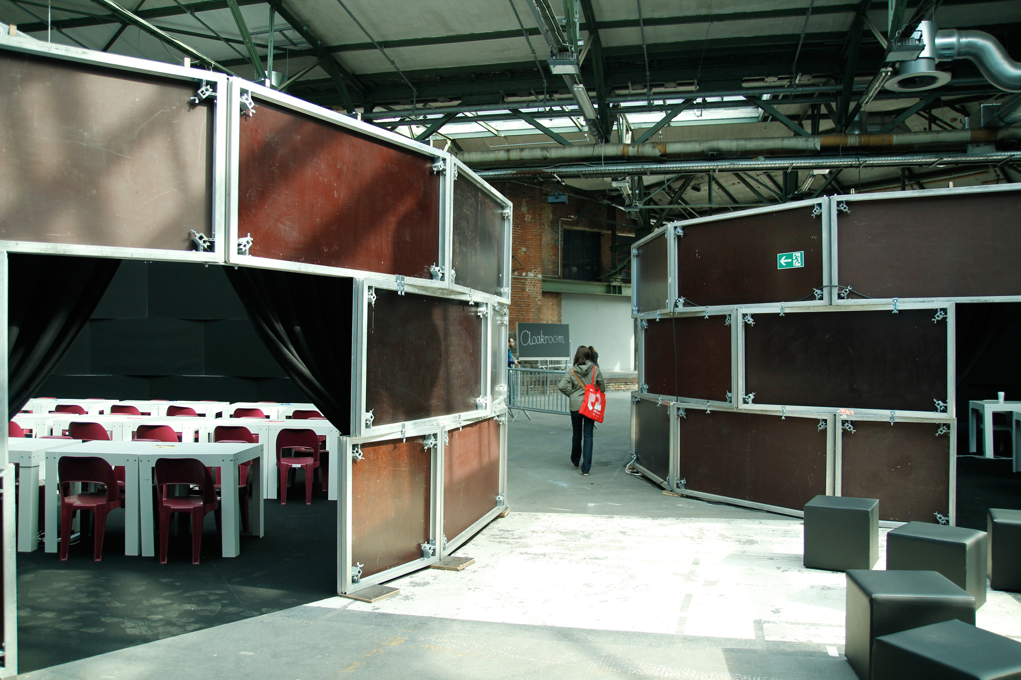 Das Design der temporäre Inseln und Räume spielt mit der Differenz von Innen und Außen. Die raue historische Halle und die offenliegenden Außenbereiche der Einbauten stehen im Widerspruch zu den dezent gestalteten Innenräumen.